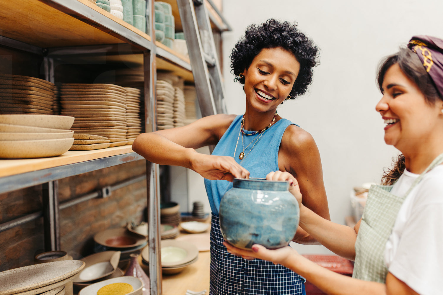 Happy young craftswomen restocking handmade ceramic products in their shop. Two female ceramists working as a team in a pottery. Creative young women running a successful small business.