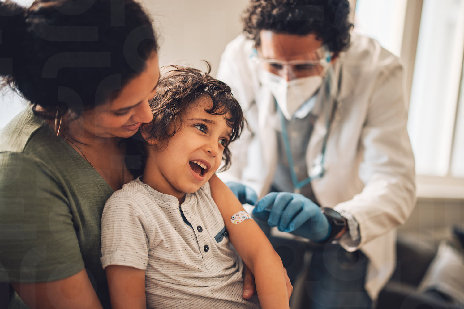 Boy getting vaccinated at home. Doctor giving vaccine to boy sitting with mother at home.
