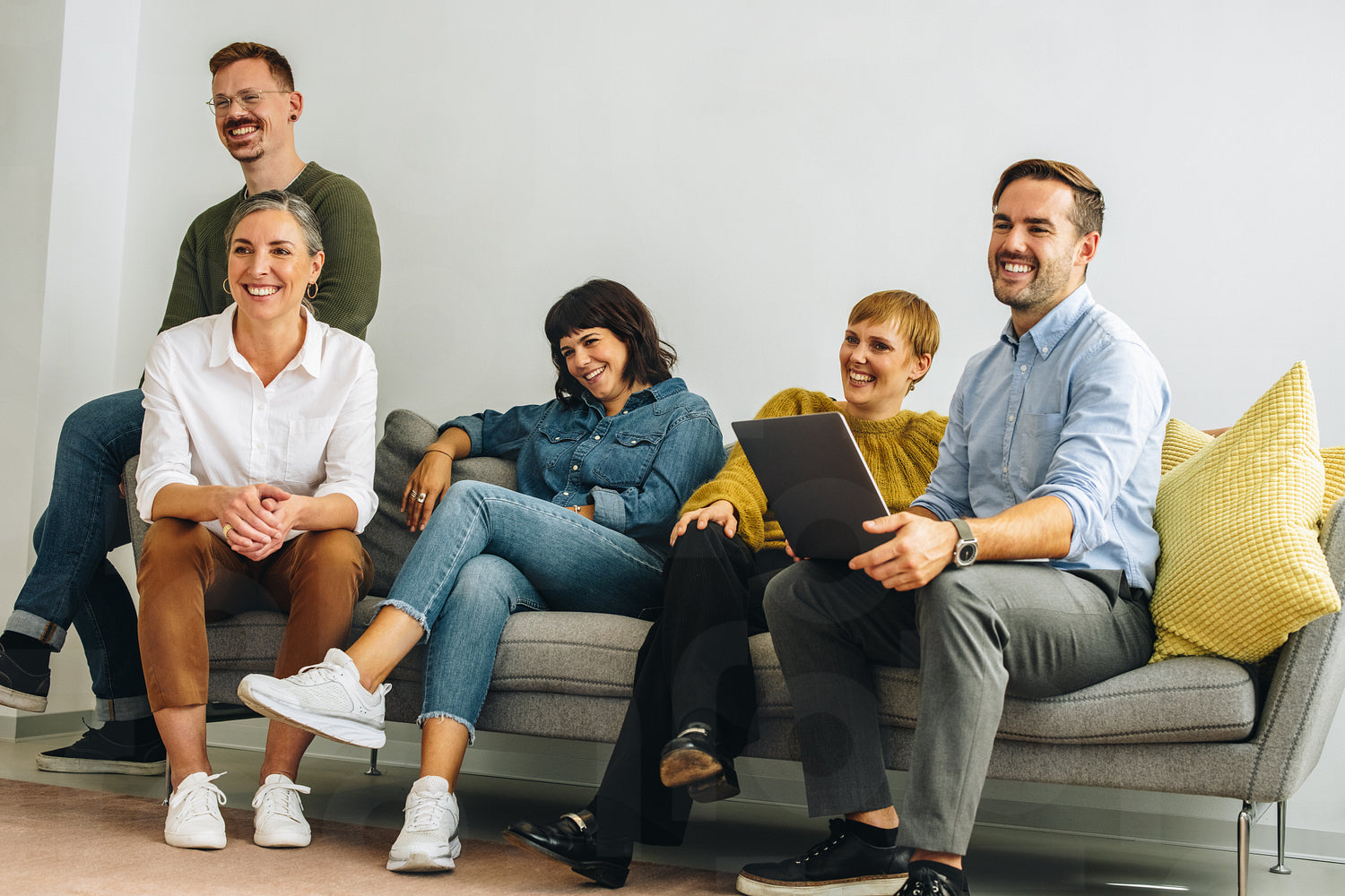 Happy business team sitting in lobby. Cheerful colleagues on the sofa and looking away.