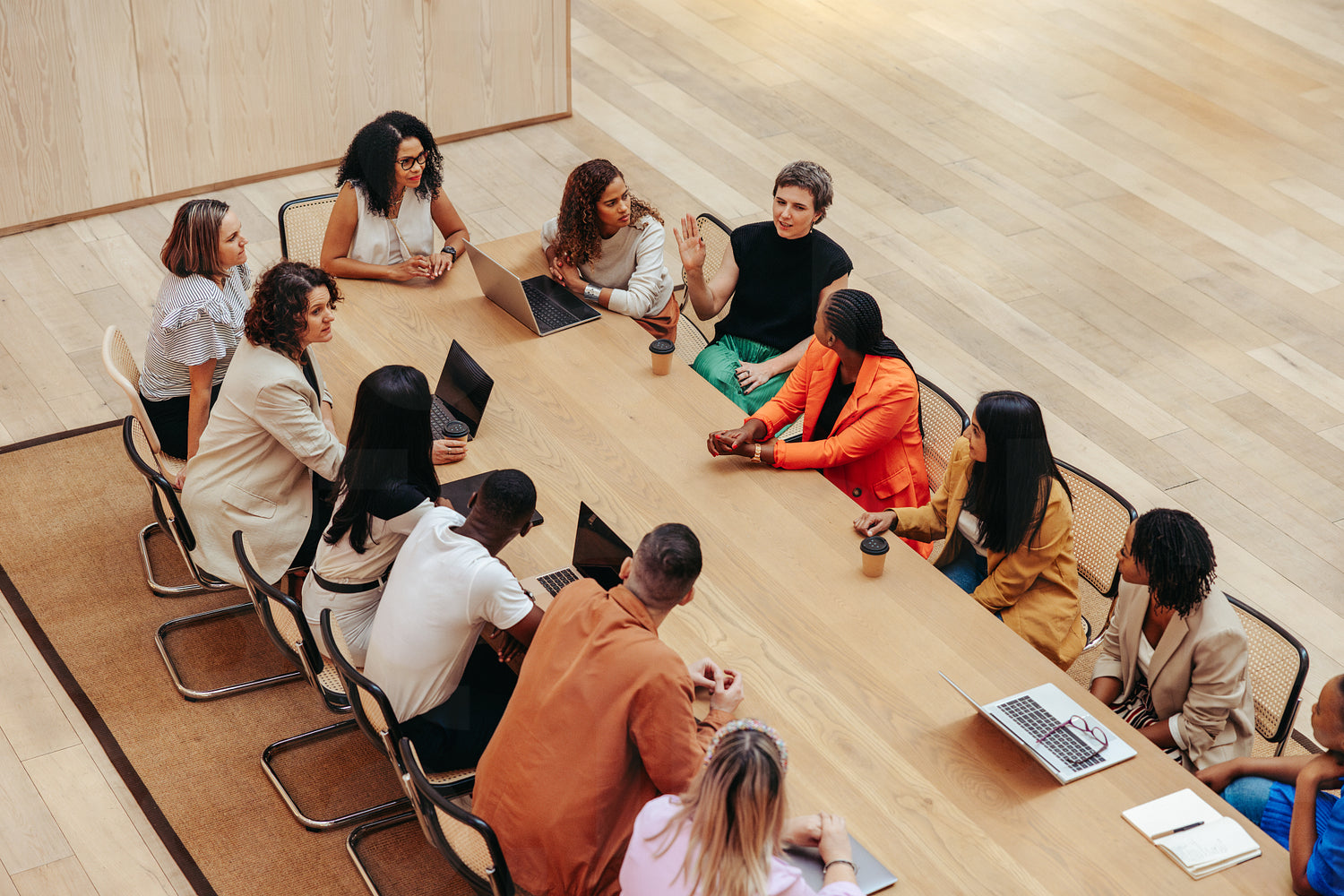 An overhead shot of a diverse group of professionals engaged in a collaborative business strategy session, highlighting teamwork and communication in a modern office environment.