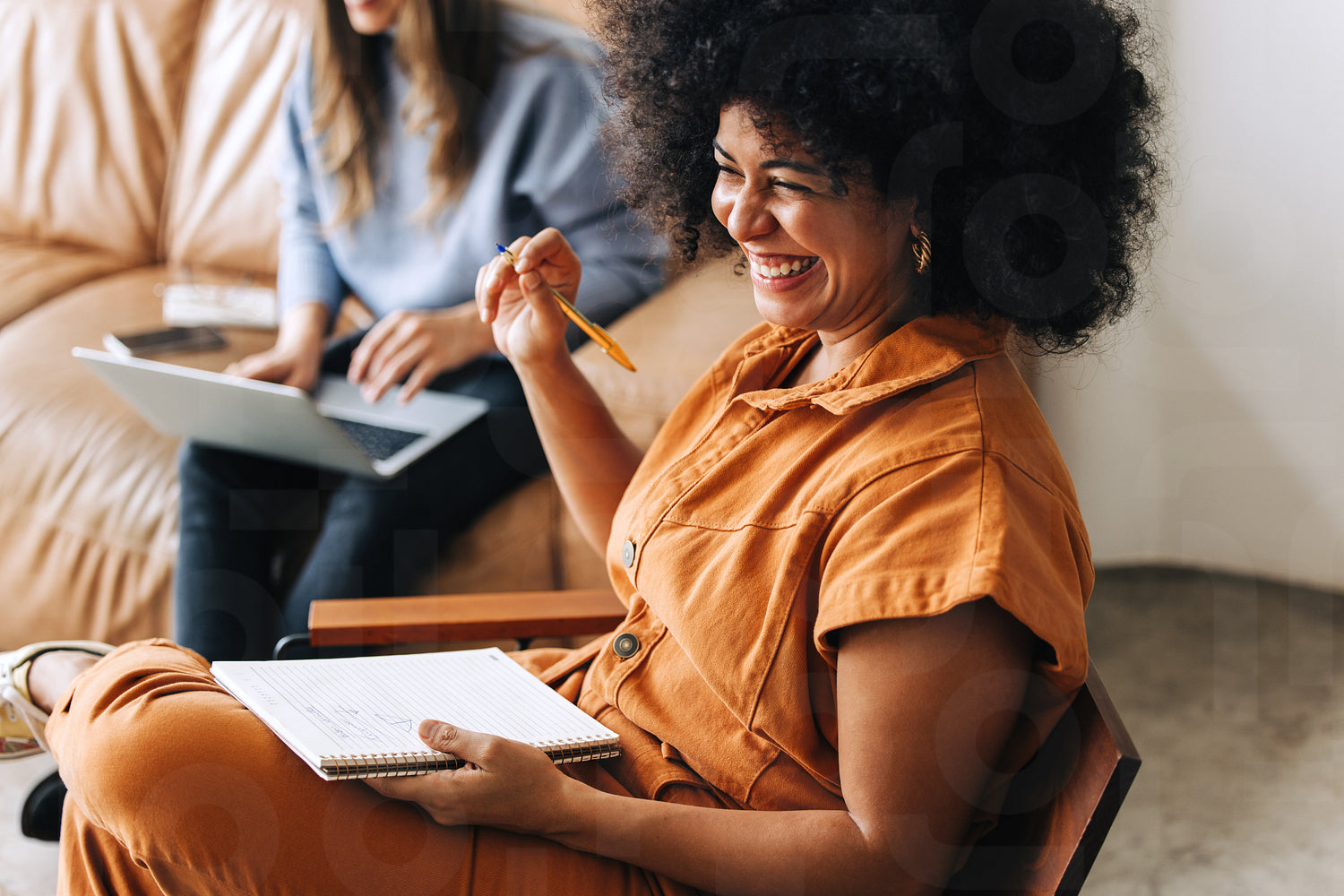 Black businesswoman smiling cheerfully while sitting with a notebook in an office lobby. Happy young businesswoman working in an office with her colleague.