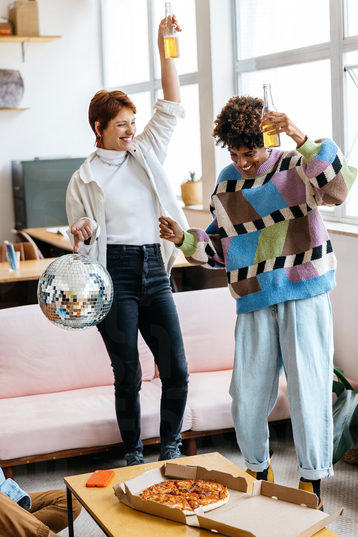 In a vibrant freelance office setting, colleagues are captured enjoying a lighthearted moment. They are sharing drinks and celebrating, likely marking the success of a joint project in their co-working environment, showcasing teamwork and camaraderie amidst a casual workday.