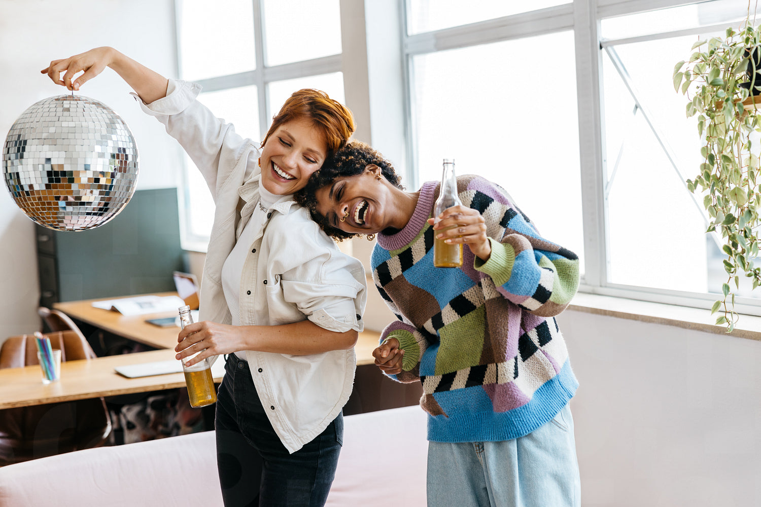 A lively and casual office break scene with colleagues sharing a fun moment under a disco ball. They reflect a modern co-working space vibe with a touch of celebration, showcasing the blend of work and leisure in a freelance setting.