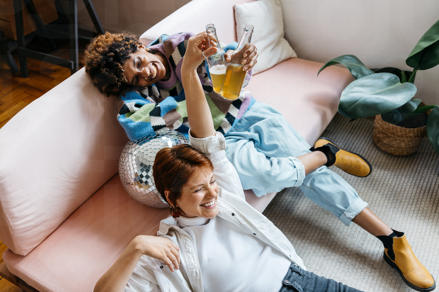 Two freelance professionals share a joyous moment while taking a break in a bright, contemporary co-working space. A casual meeting with comfort and fun.