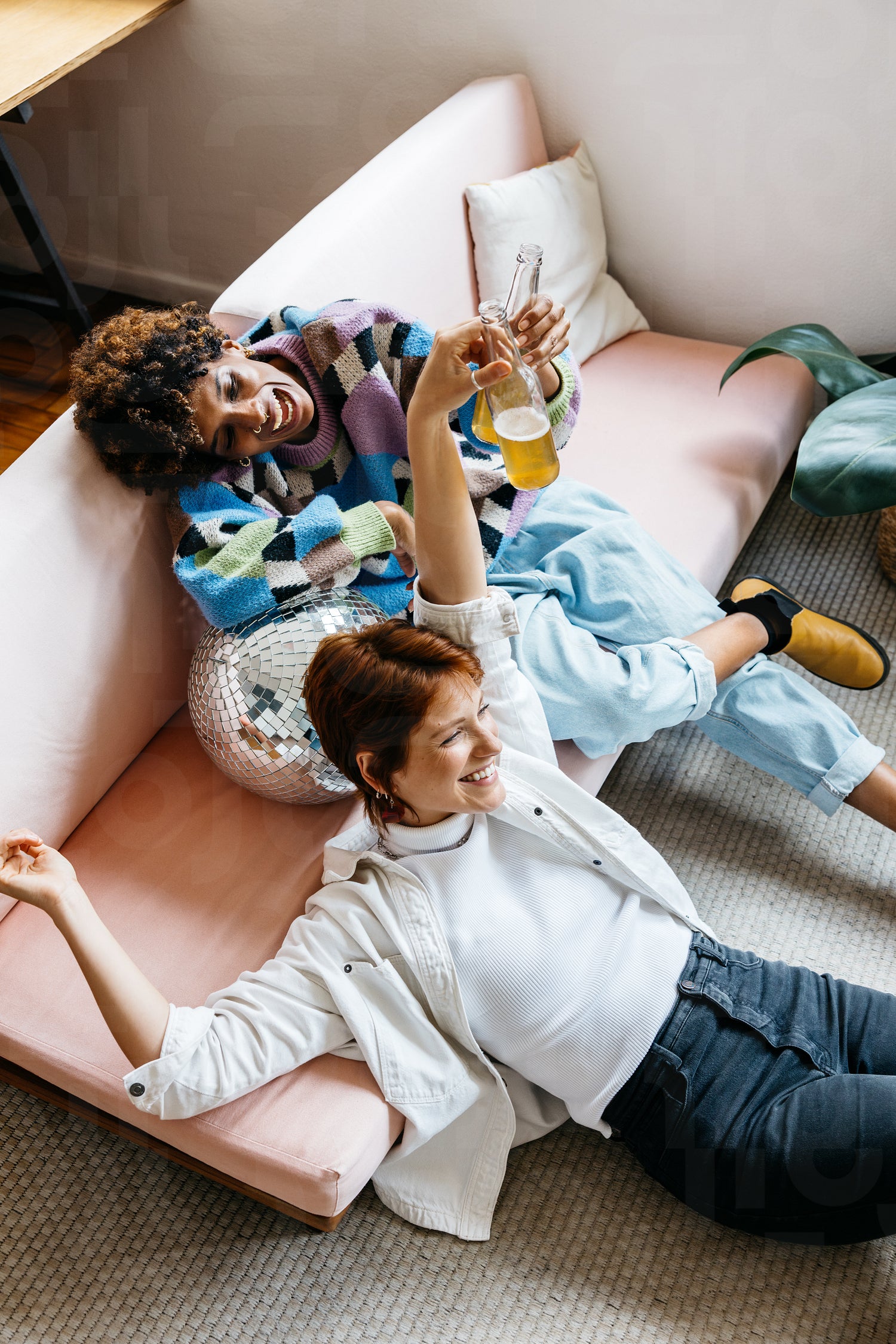 Two colleagues relax on a couch, showcasing a casual freelance office setting. A joyful break from work in a co-working environment, underlining the balance between work and leisure in modern freelance culture.