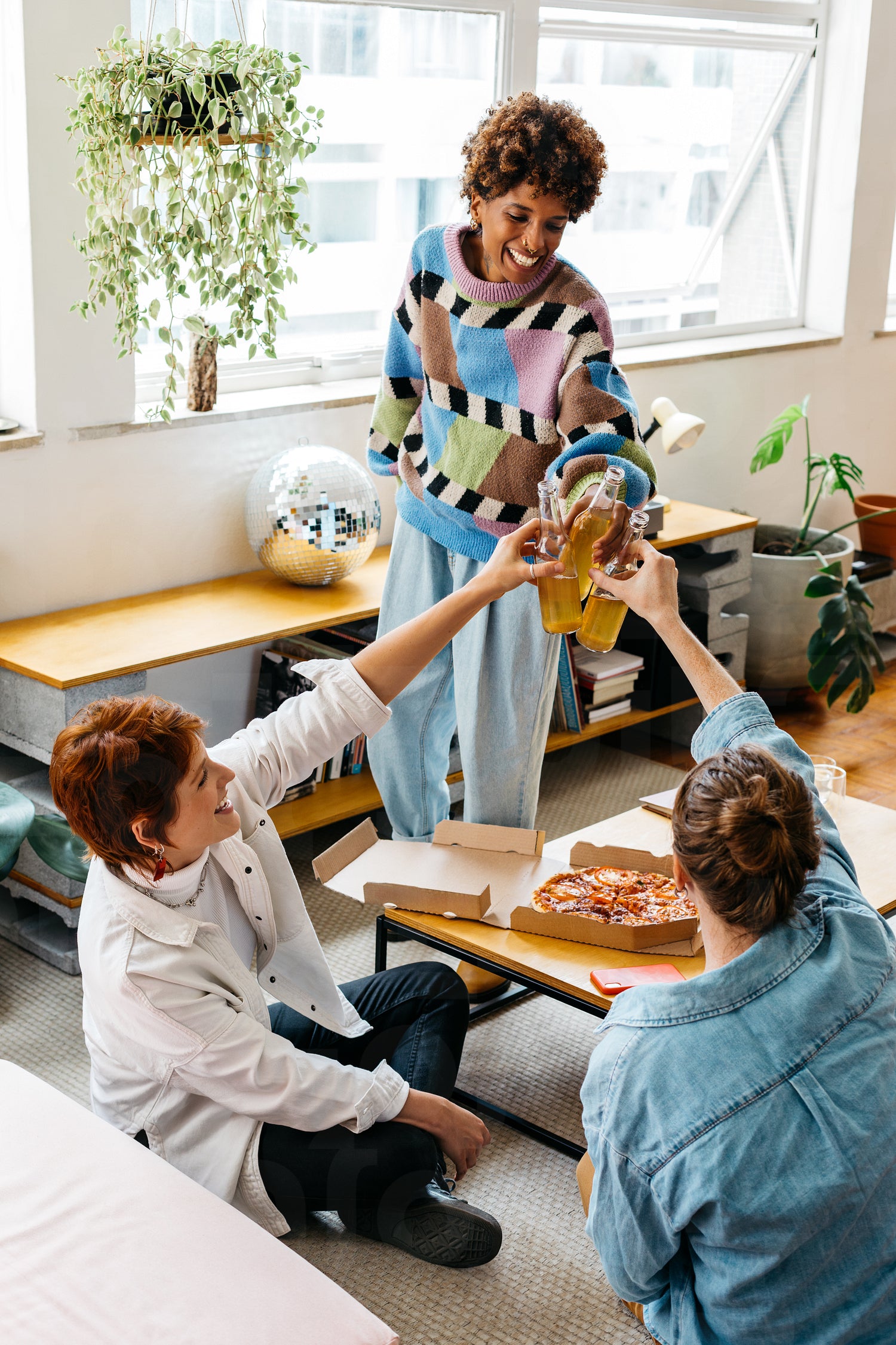 In a bright, modern co-working space, colleagues enjoy a casual meal together. A moment of camaraderie and relaxed interaction is captured among freelancers in an informal office environment.