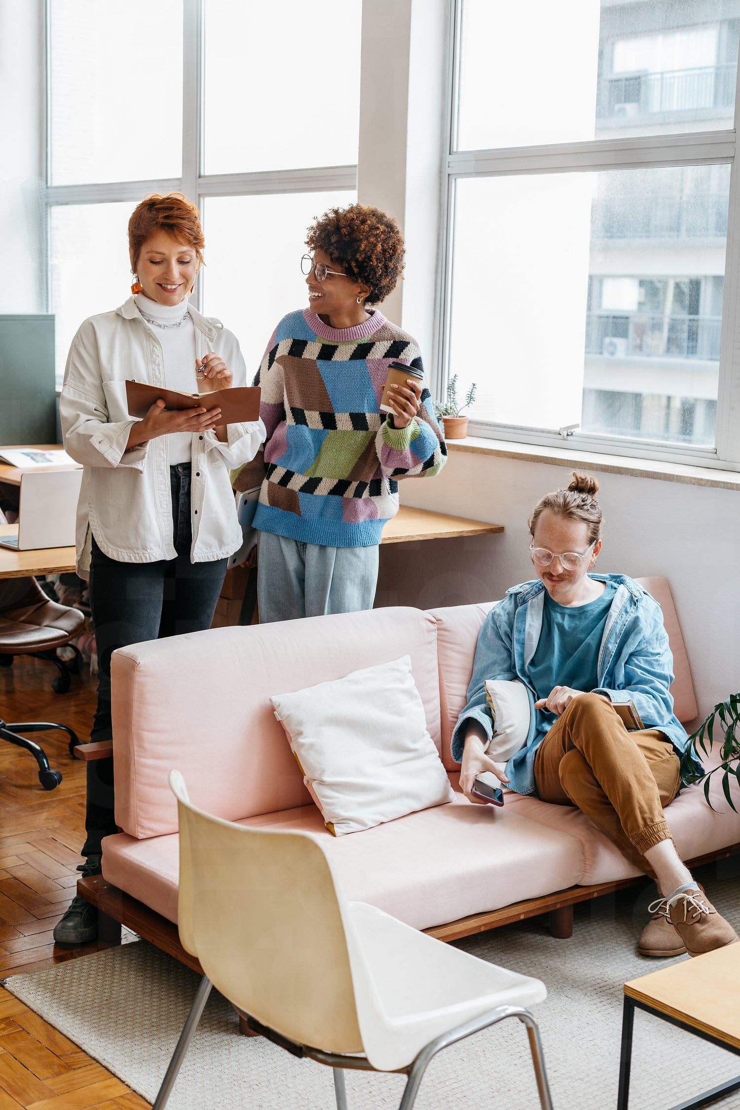 A diverse group of freelancers engage in a project discussion in a bright, contemporary co-working space, embodying teamwork, creativity, and partnership in a freelance office setting.