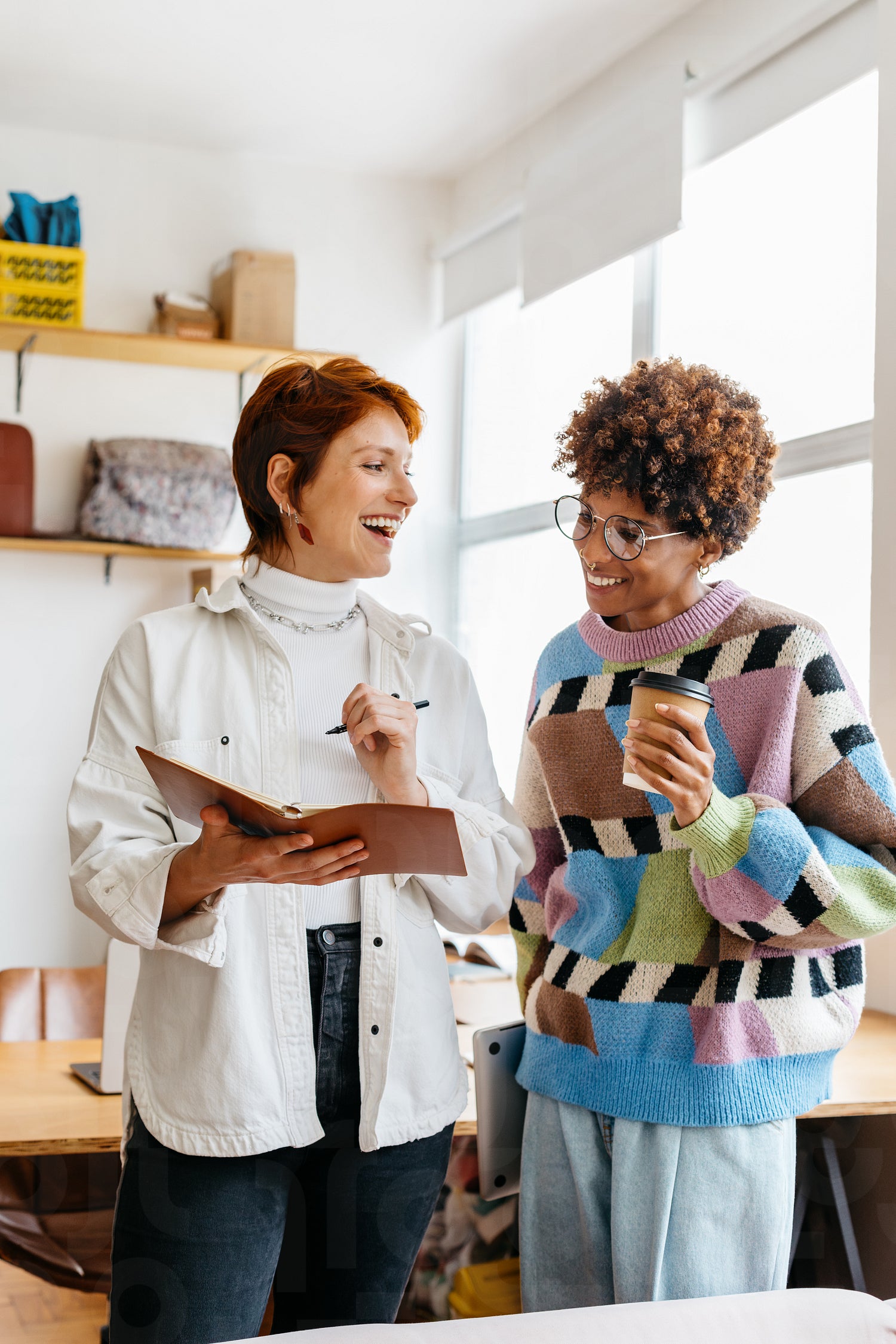 Two freelance professionals collaborate and share ideas in a bright co-working office space. The concept of teamwork in modern freelance work is exemplified in this inviting setting.