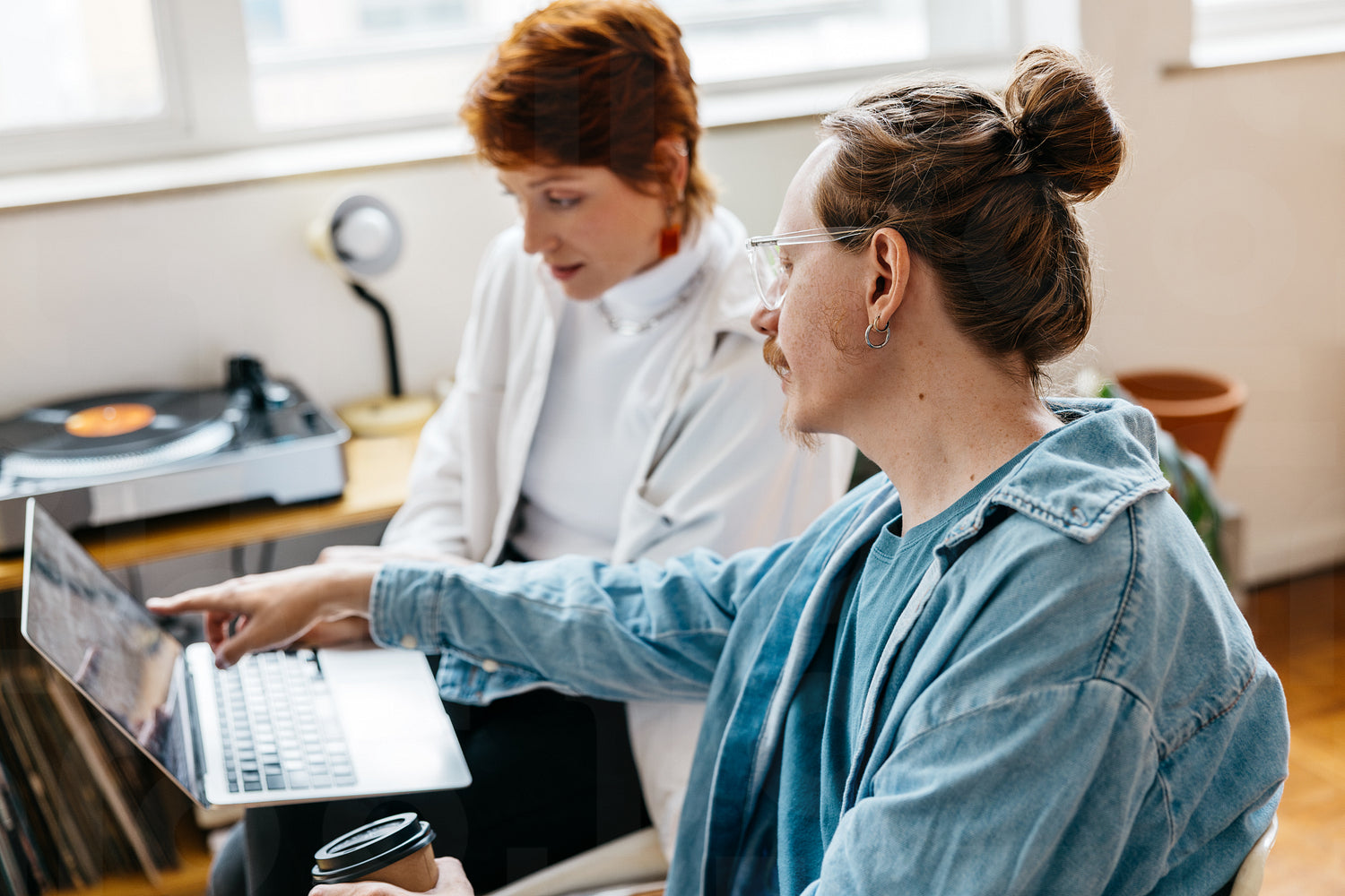 Two freelance colleagues collaborate in a bright co-working space, sharing ideas over a laptop with coffee, embodying teamwork and partnership in a casual office setting.