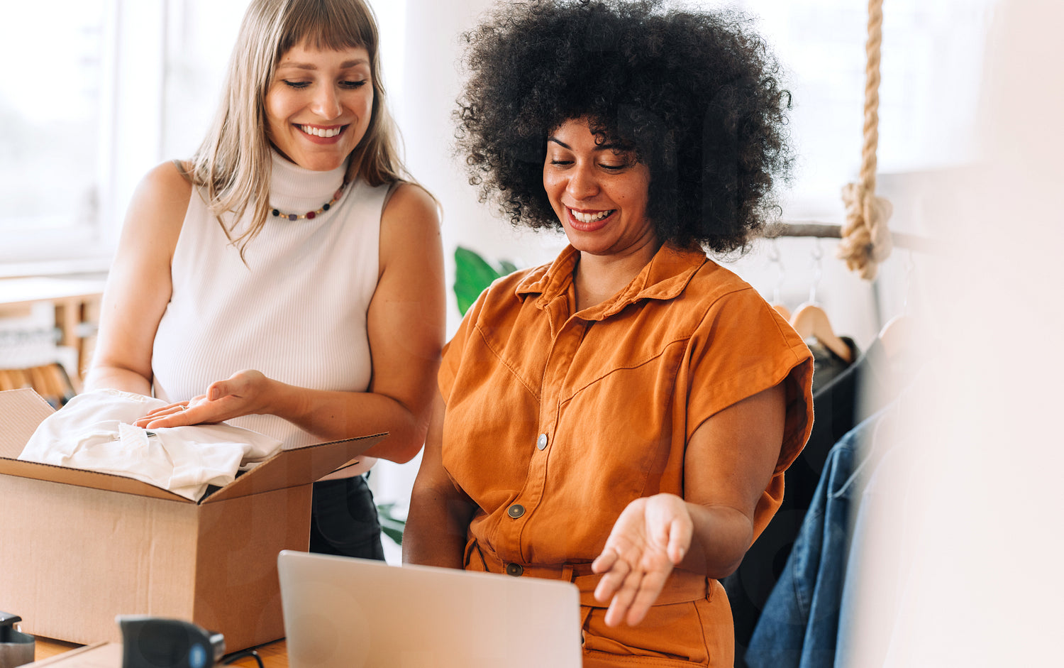 Two businesswomen using a laptop while preparing a delivery parcel in a thrift store. Happy small business owners making plans for a shipment. Two female entrepreneurs running an online clothing store.