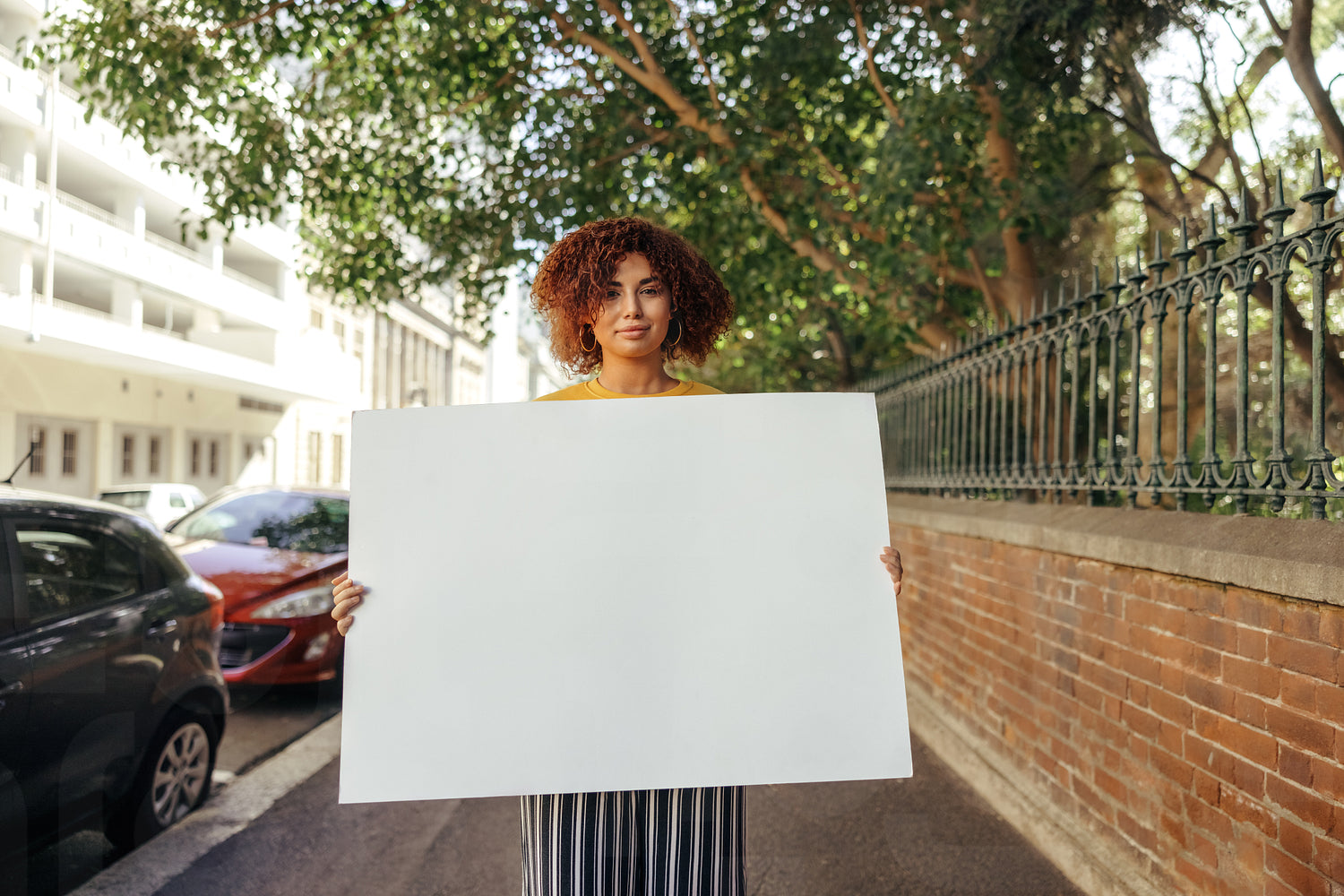 Confident teenage girl holding a blank white placard in the city. Young female activist displaying a banner while standing on an urban sidewalk. Assertive teenager looking at the camera.