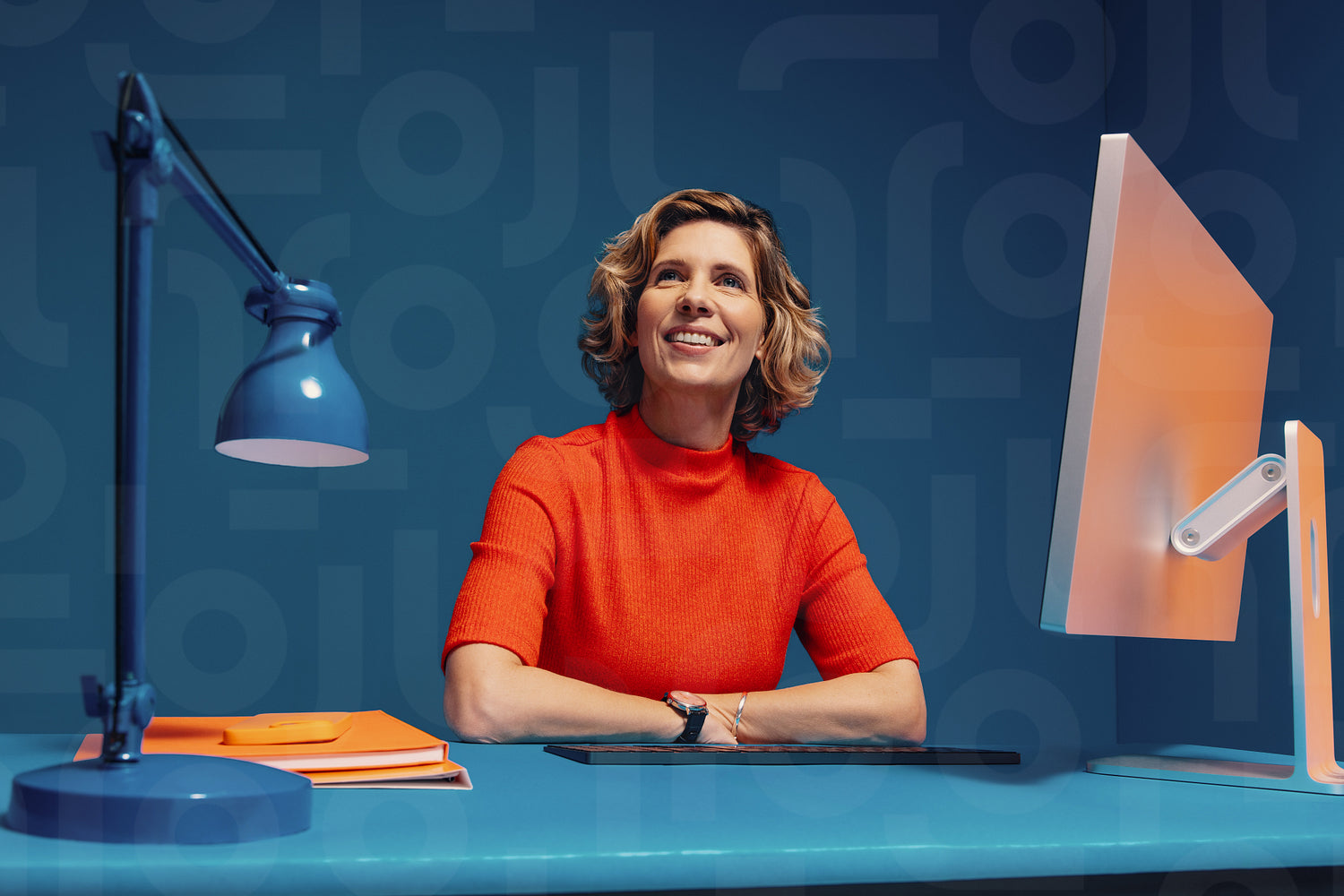 Confident mature woman manager sitting in a vibrant color blocking office shot setting, showcasing professionalism and authority.