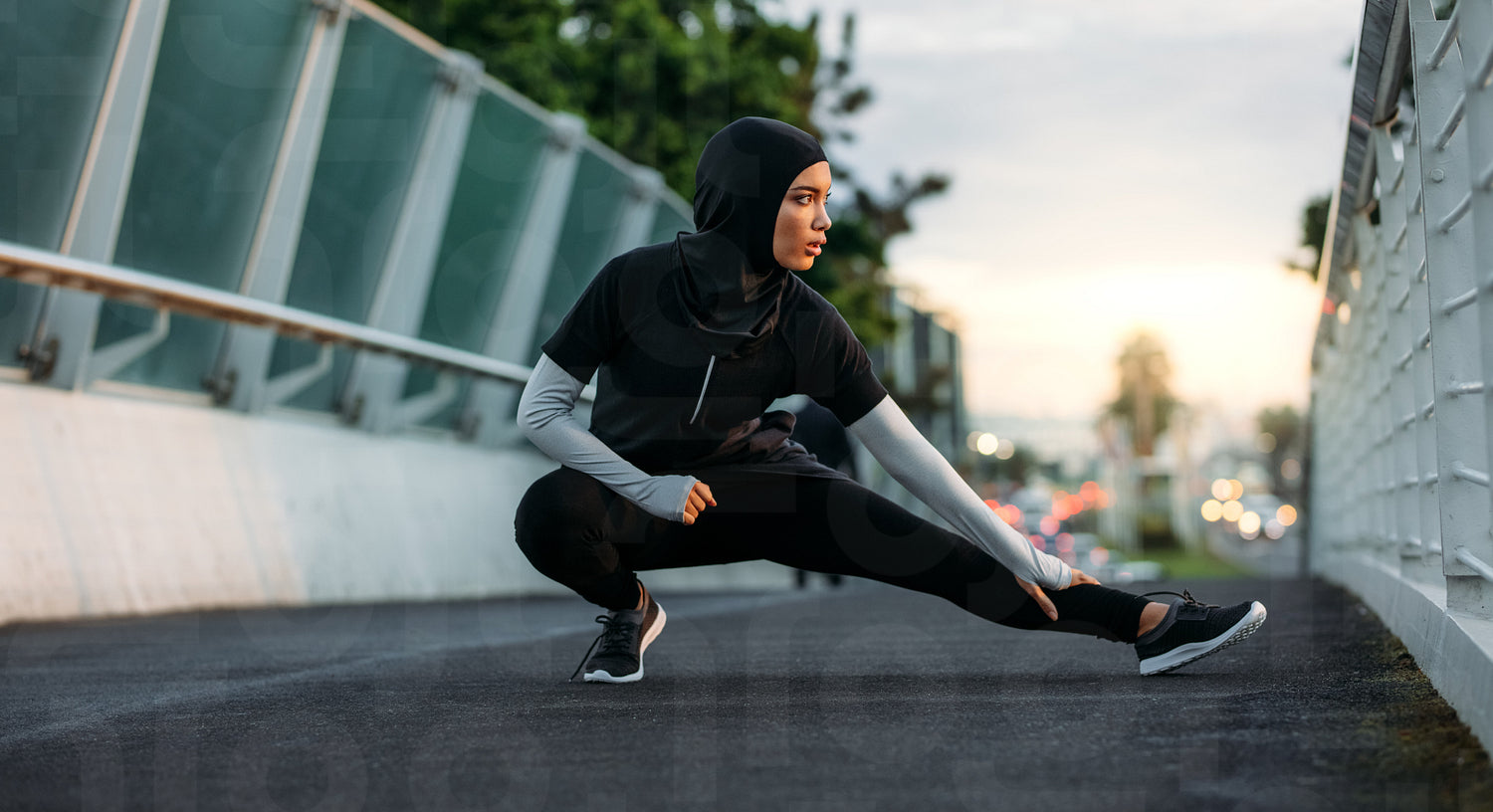 Hijab girl exercising on walkway bridge in early morning. Muslim woman wearing sports clothes doing stretching workout outdoors.