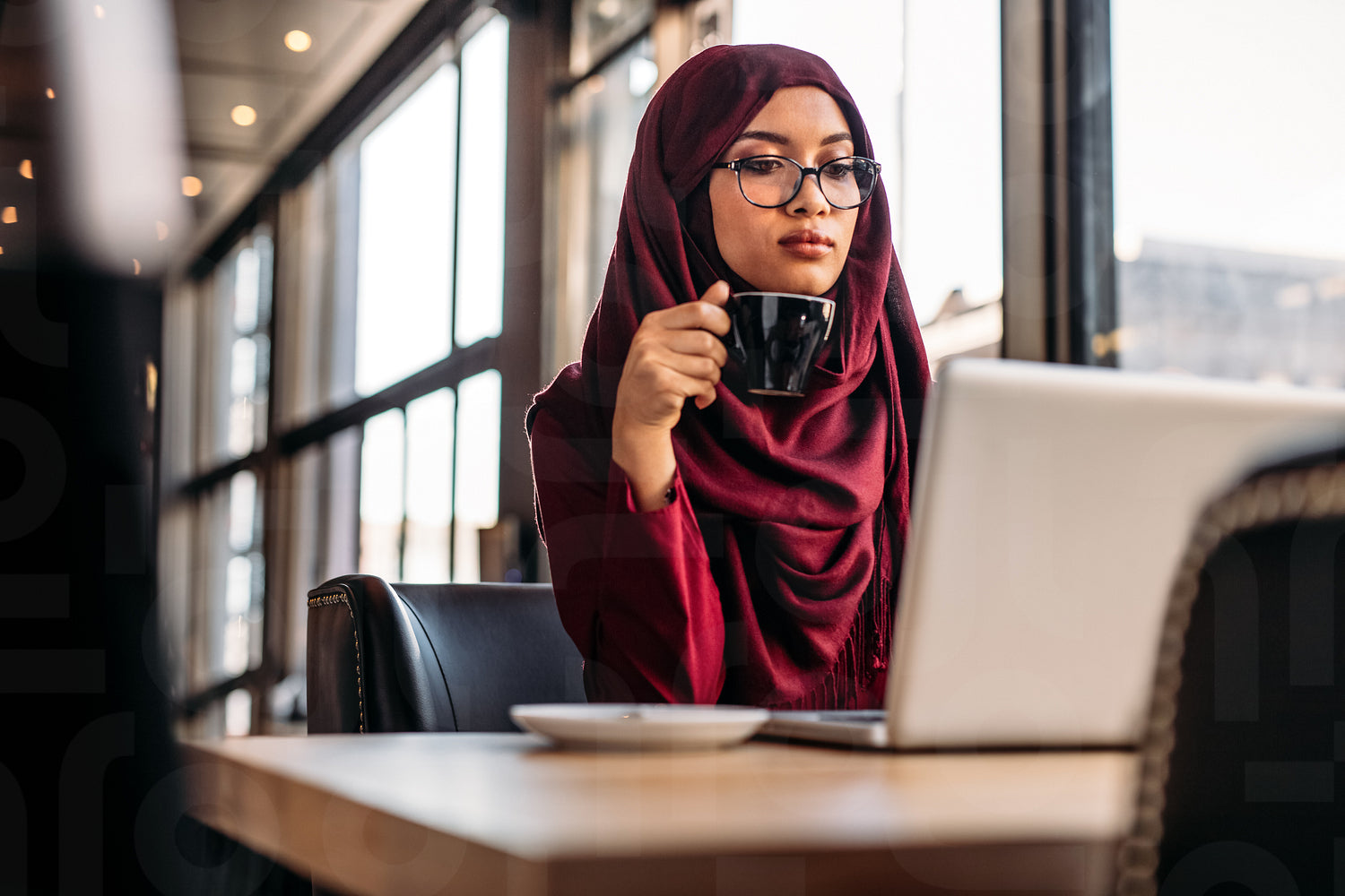 Muslim woman working at a cafe and using laptop computer. Female in hijab drinking coffee and looking at laptop in table at restaurant.