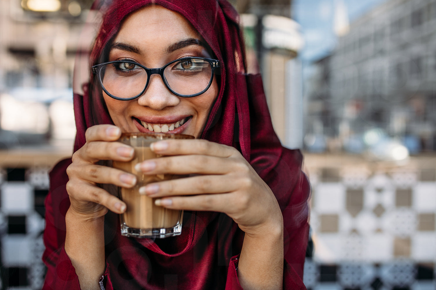 Close up portrait of smiling muslim woman wearing eyeglasses drinking coffee. Woman in hijab having coffee at coffee shop.
