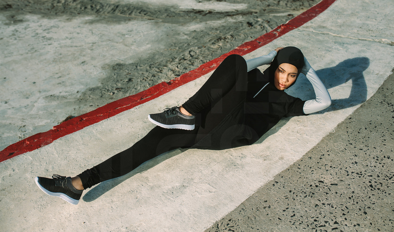 Sports woman in hijab doing bicycle crunch workout outdoors. Female lying on concrete floor and doing abs workout exercises in morning.