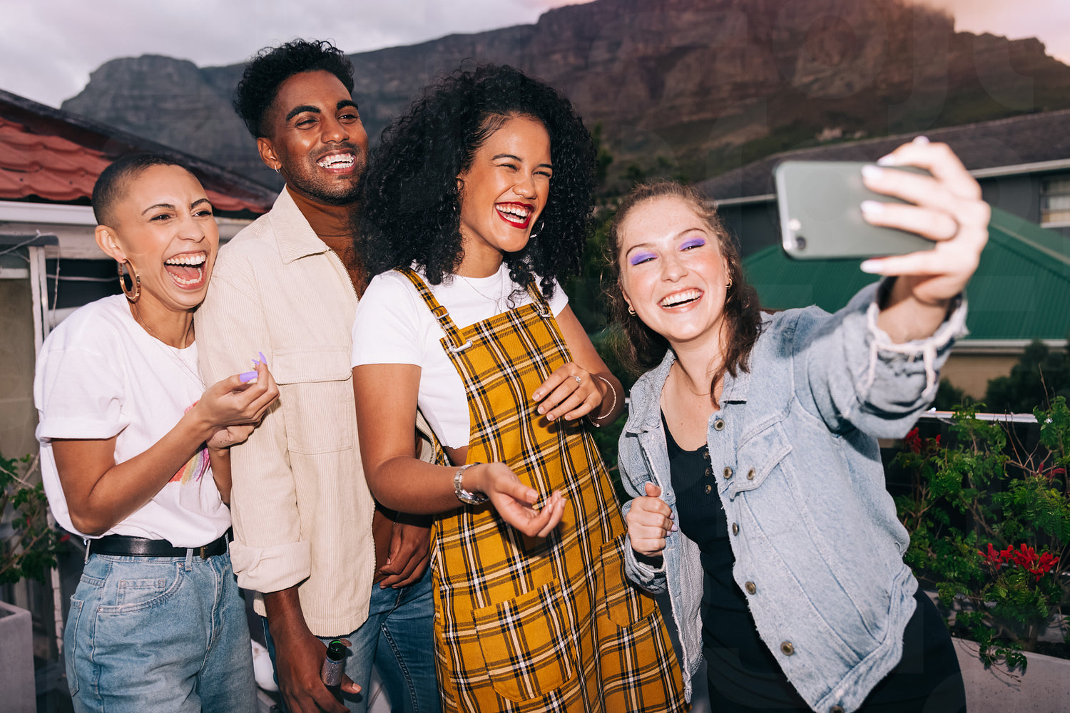 Capturing happy smiles. Four happy generation z friends taking a group selfie on a camera phone. Group of multicultural friends having a good time together on the weekend.