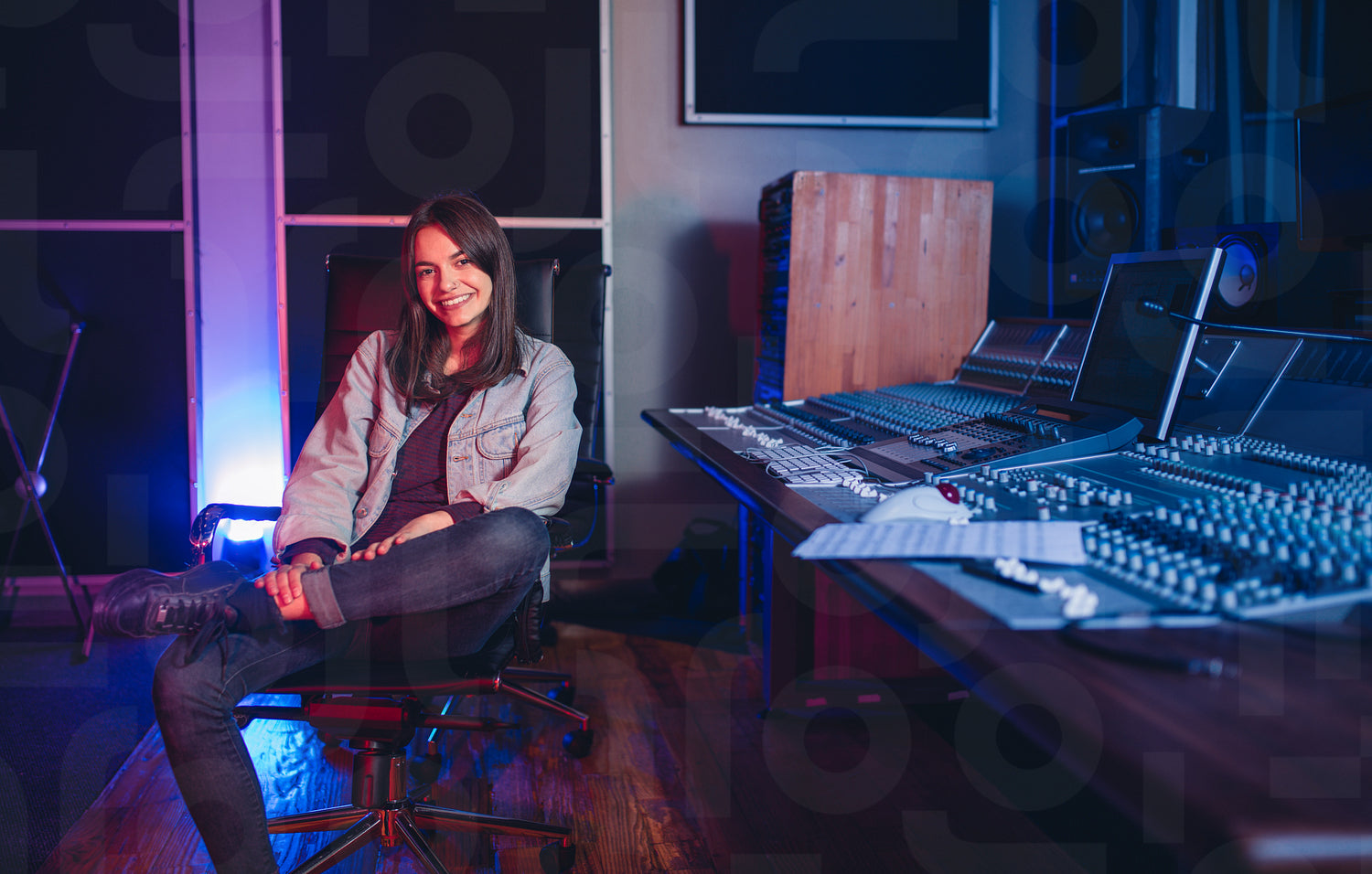 Happy young woman sitting in sound recording studio. Female music composer sitting by sound mixing console.