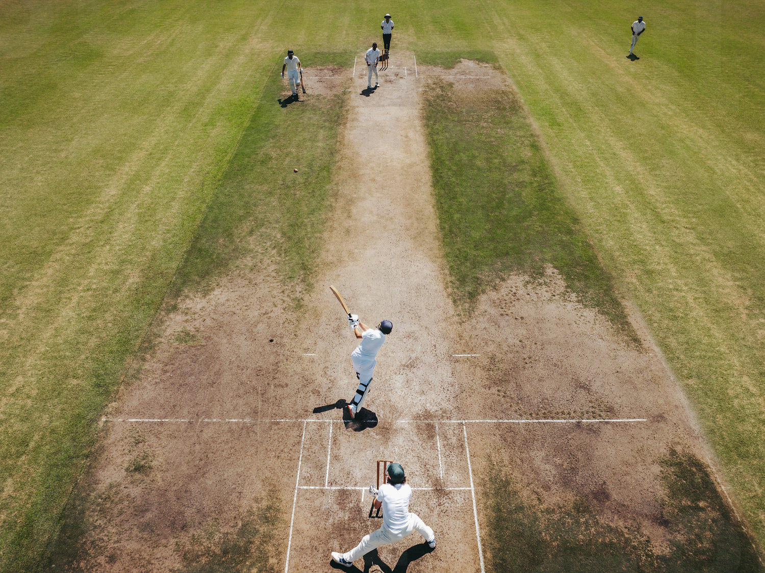 Top view of a cricket player swinging the bat to strike the ball on a grassy cricket field. The match showcases athletic skill, and the moment captures the intensity of the sport.
