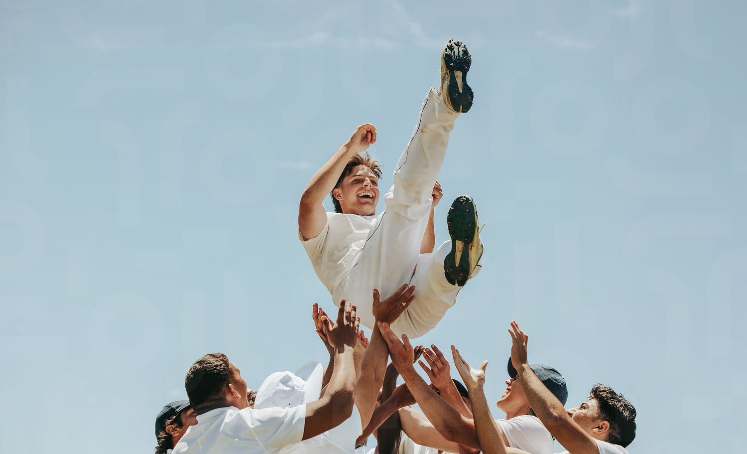A group of cricket players joyfully lift a team member to celebrate a shared achievement. The dynamic and cheerful moment highlights camaraderie and success, set against a bright and clear blue sky.