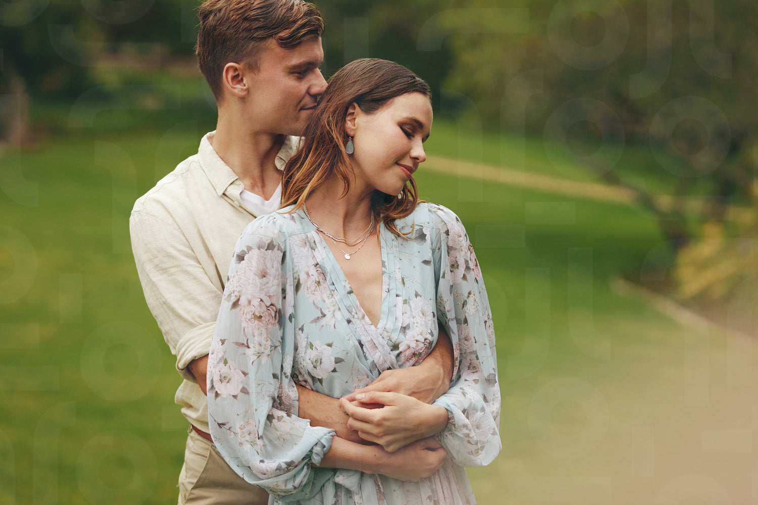 Man embracing his girlfriend from behind at the park. Affectionate couple at the park.