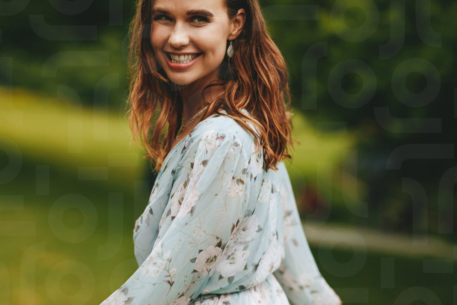 Beautiful woman walking in the park. Attractive woman with brown hair looking over her shoulder and smiling outdoors.