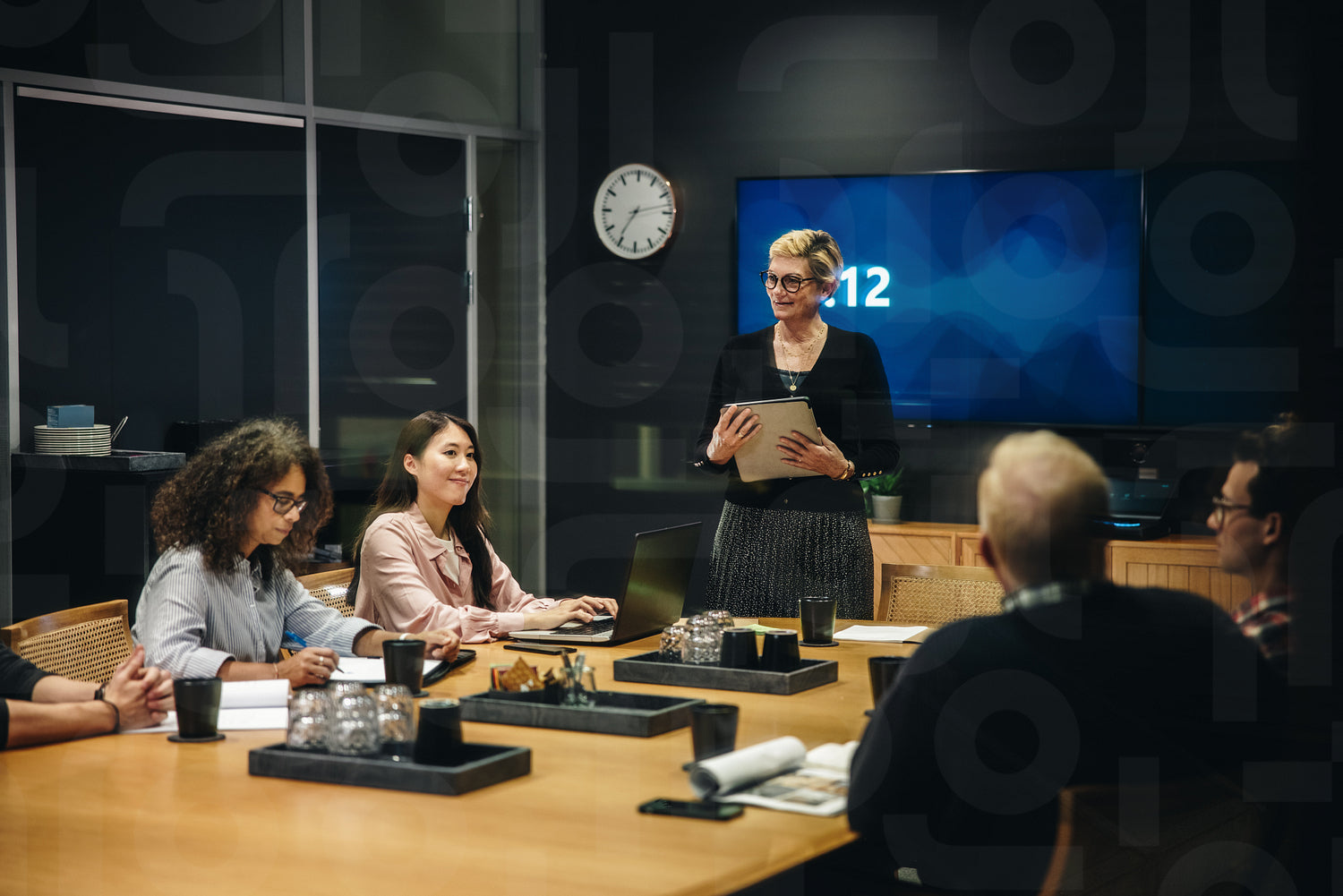 Businesswoman addressing a boardroom meeting with colleagues sitting at table. Female manager addressing her team at a meeting.