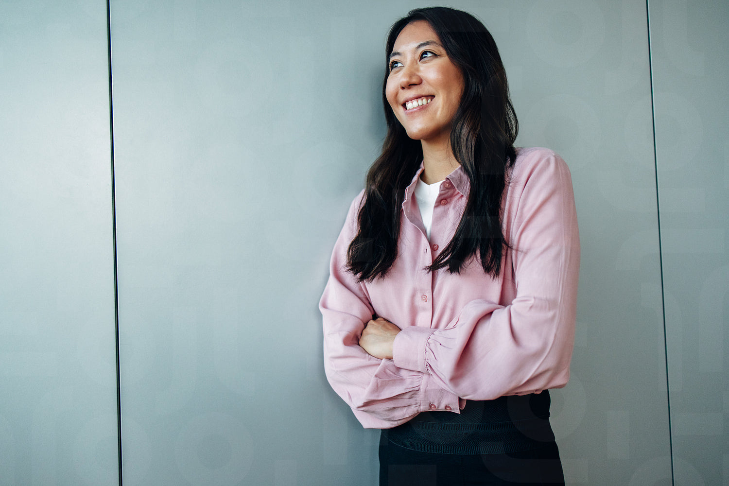 Portrait of determined young woman standing with her arms crossed against a wall. Happy business woman looking away and smiling.