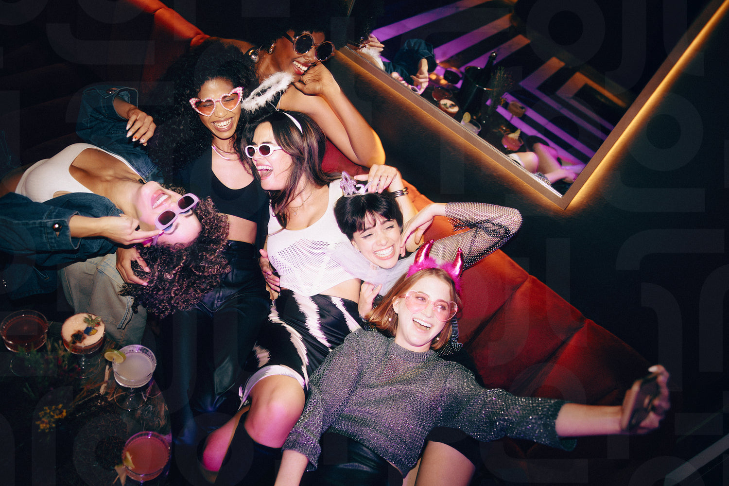 Friends gather in a vibrant nightclub, laughing and enjoying their time together. The setting includes vivid lighting and festive props. This photo has intentional use of 35mm film grain.