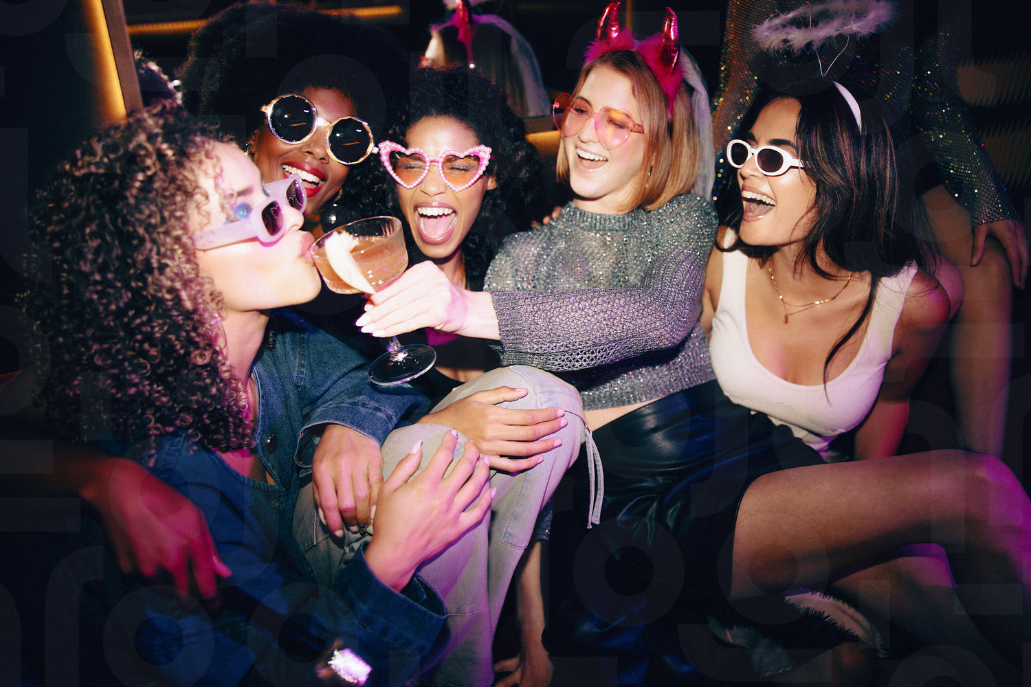 A group of friends celebrates joyfully at a party, dressed up and sharing drinks together. Happiness, social connection, and a festive ambiance. This photo has intentional use of 35mm film grain.