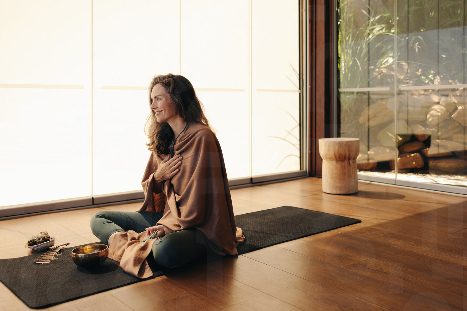 Happy senior woman meditating using alternative medicine at home. Mature woman practicing a self-healing and purifying ceremony on a yoga mat. Cheerful senior woman living a holistic lifestyle.
