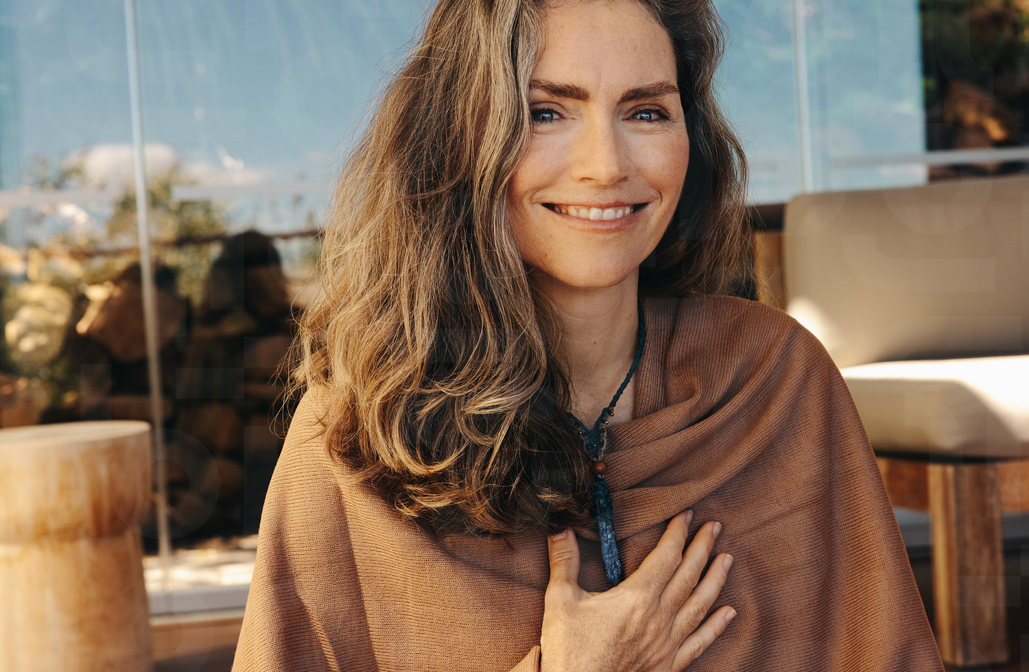 Happy senior woman smiling at the camera while wearing a crystal necklace. Mature woman practicing crystal healing on her chest chakra. Cheerful woman following a holistic lifestyle at home.
