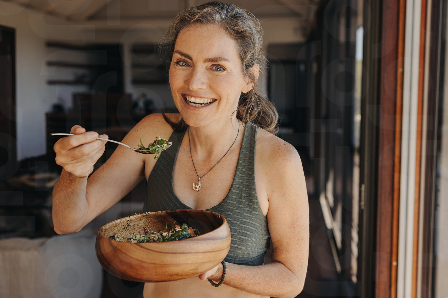 Happy vegan woman smiling at the camera while eating a vegetable salad from a bowl. Senior woman enjoying a plant-based breakfast after a home workout. Mature woman taking care of her ageing body.