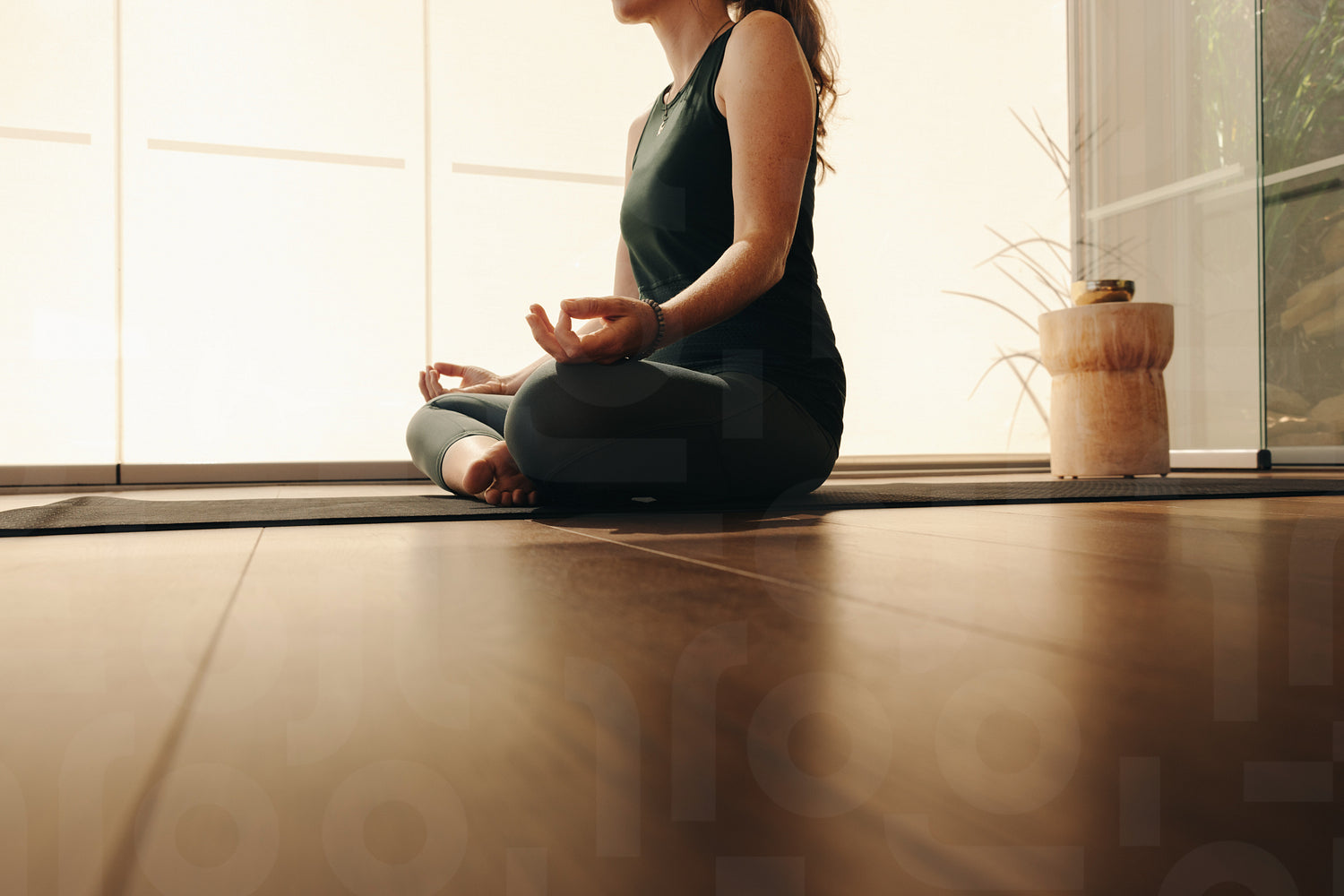Mature woman meditating while practicing hatha yoga. Unrecognisable woman doing a breathing exercise while sitting in easy pose. Senior woman following a healthy workout routine at home.