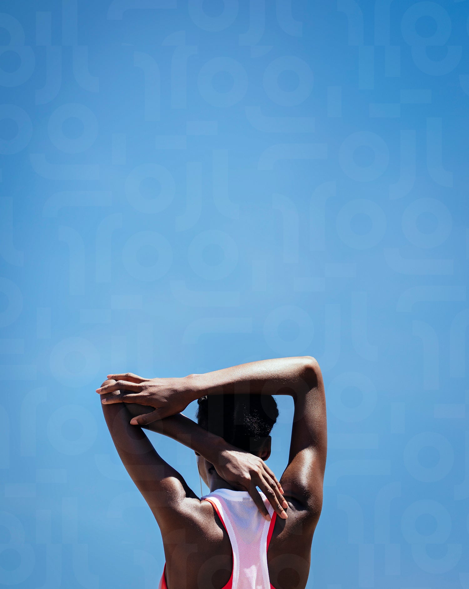 Rear view of a woman stretching arm muscles against blue sky outdoors. Fitness woman doing warmup exercise outdoors.
