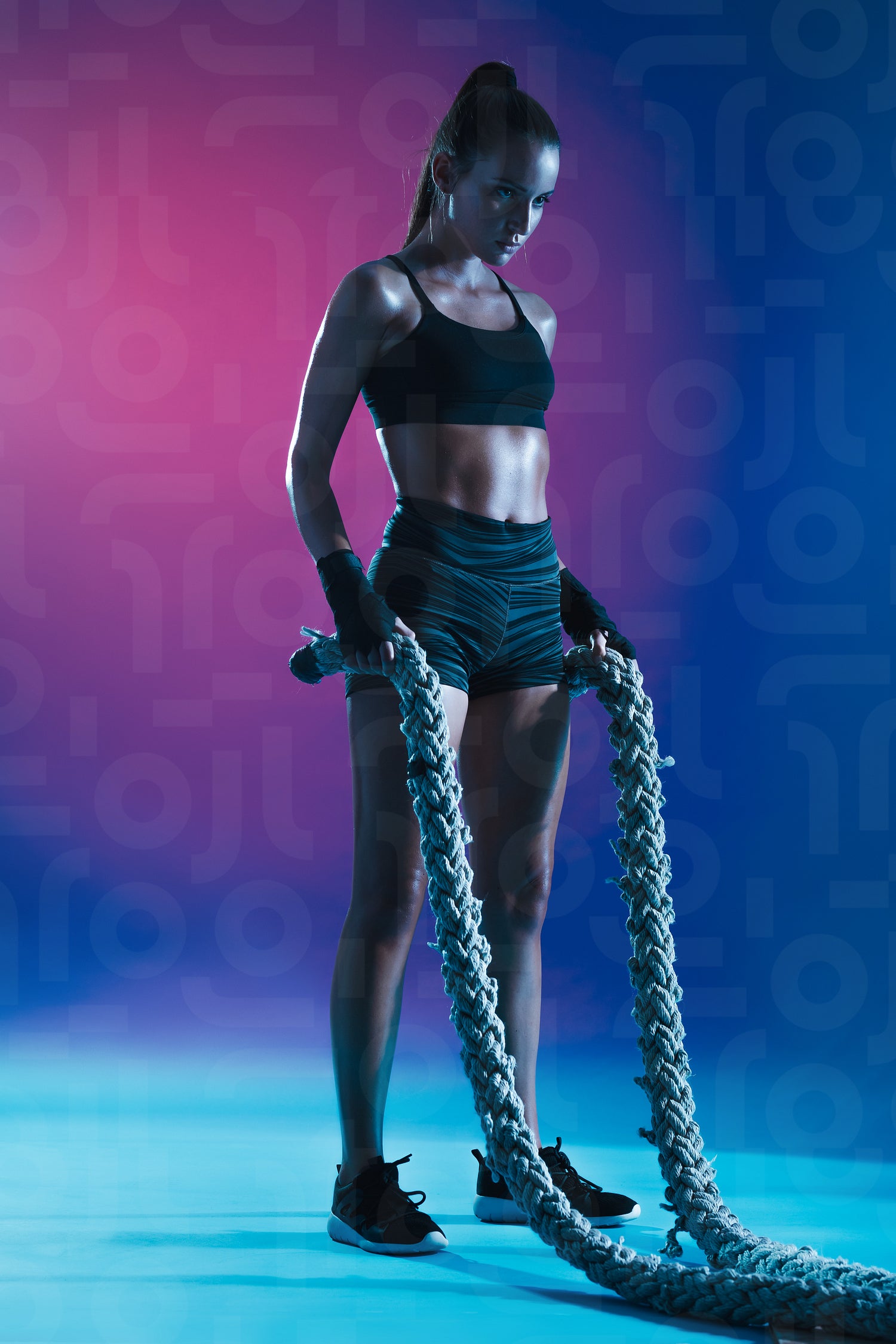Tough fitness woman using battle ropes for exercising. Female working out with battle ropes at cross training gym.