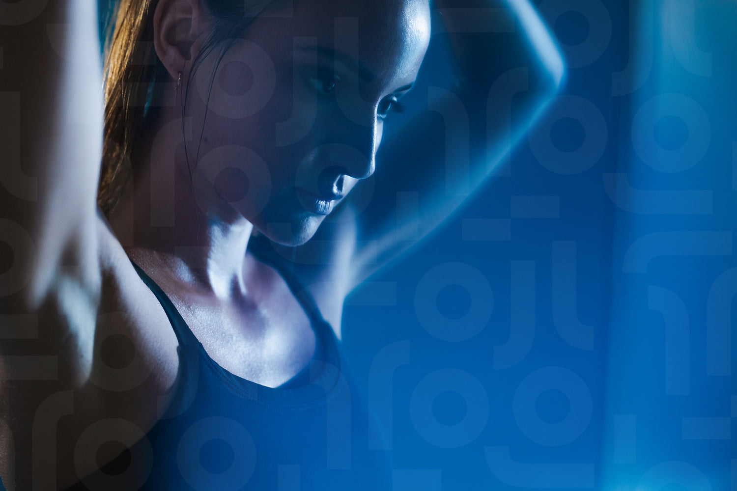 Close up of young woman tying her hair and getting ready for workout. Sportswoman with preparing for training session with a color filter in front.