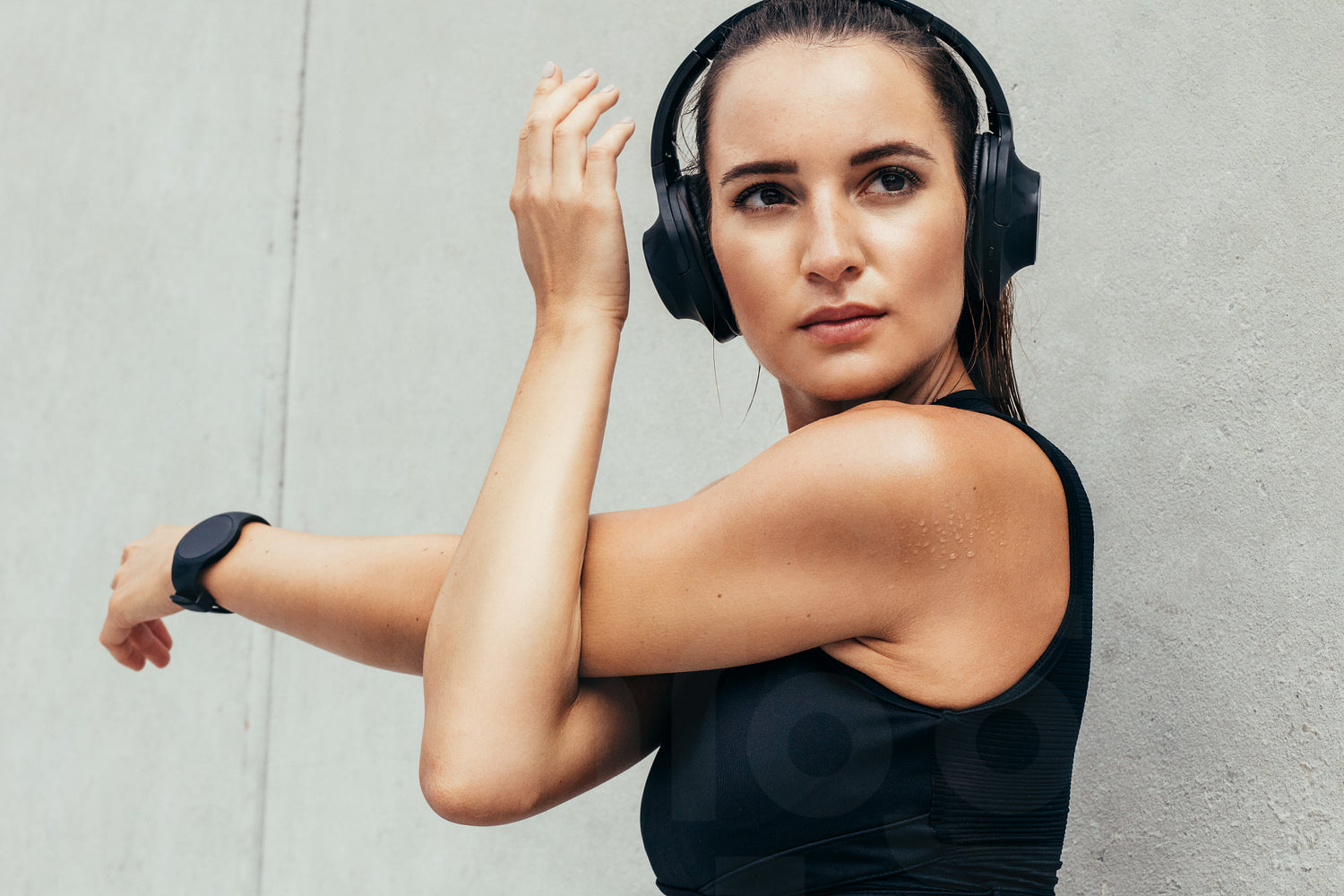 Fit young woman stretching her arms outdoors. Woman in sportswear and heaphones doing warmup exercise in the morning against grey wall.