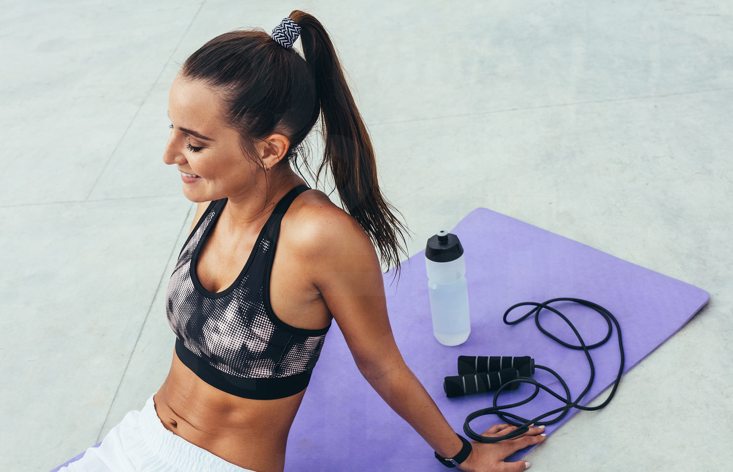 Young woman sitting on fitness mat after workout. Female athlete resting after intense workout with water bottle and skipping rope on the side.