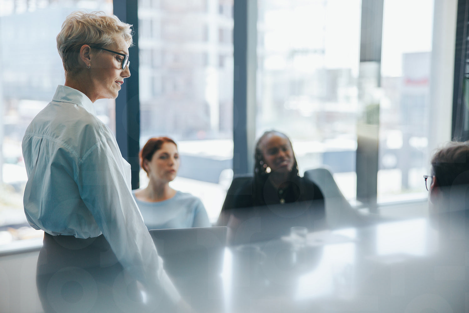 Professional businesswoman leads a meeting with diverse team of colleagues