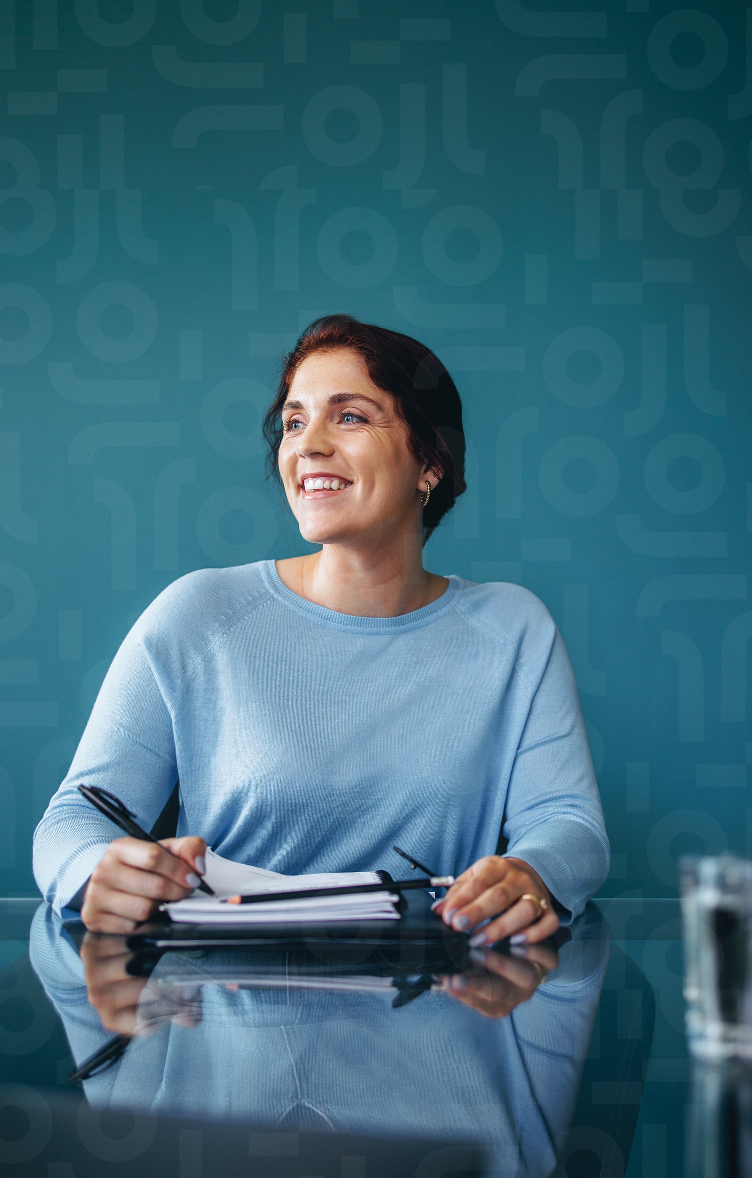 Young professional woman smiles as she takes notes and participates in a meeting at work. Business woman sitting at a boardroom table, engaged in a team discussion with her colleagues.