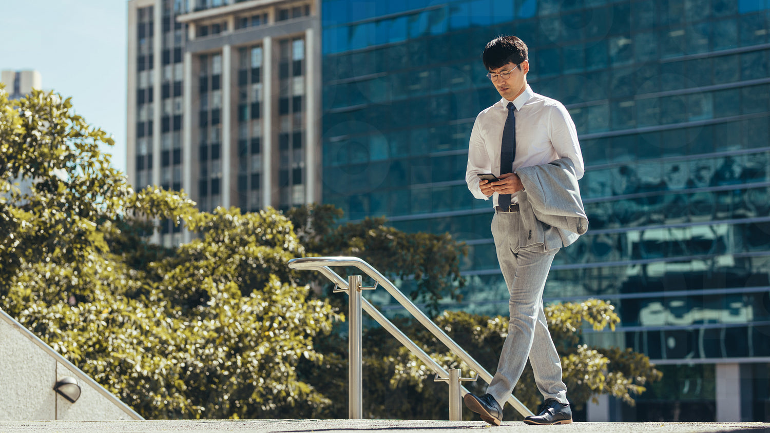 Asian businessman walking outdoors in city using smart phone. Man professional walking and using a smart phone outdoor.