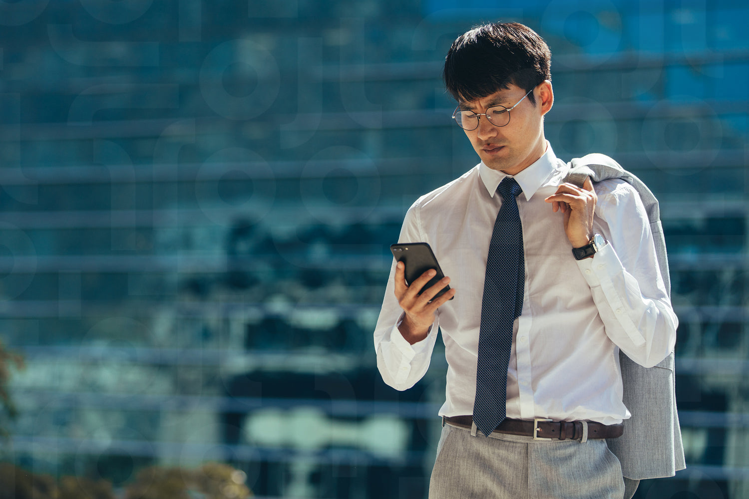 Asian businessman walking outdoors using his smart phone. Man reading text message on his mobile phone while walking outdoor against building.