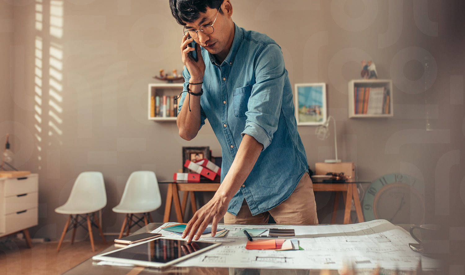 Architect talking with client over mobile phone while working at his desk. Creative professional answering phone call with working on digital tablet at his workdesk.