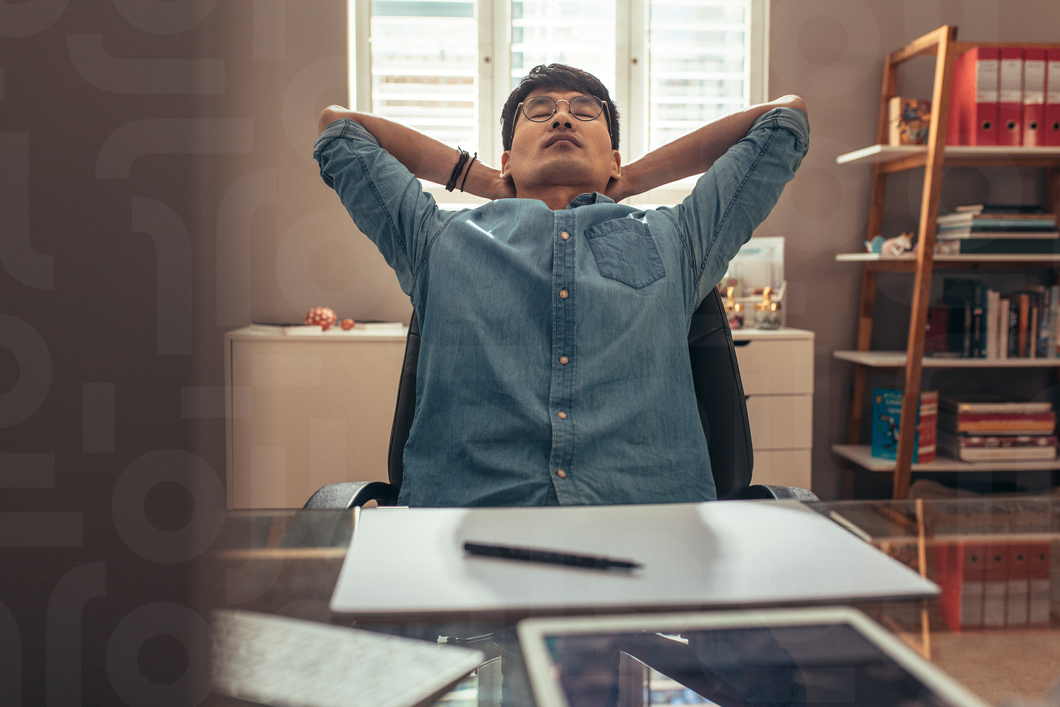 Creative professional sitting at his office, reclining in chair with hands behind head and eyes closed. Designer taking break from work at his desk.