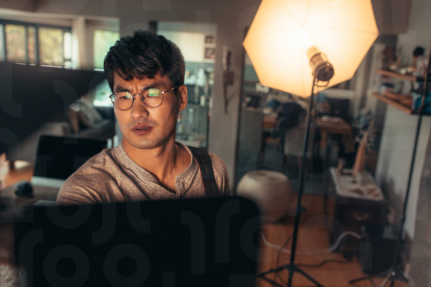 Photographer adjusts equipment flash light in the photo studio before the shoot. Asian photographer working in his studio making minor adjustments of light equipments prior the shoot.