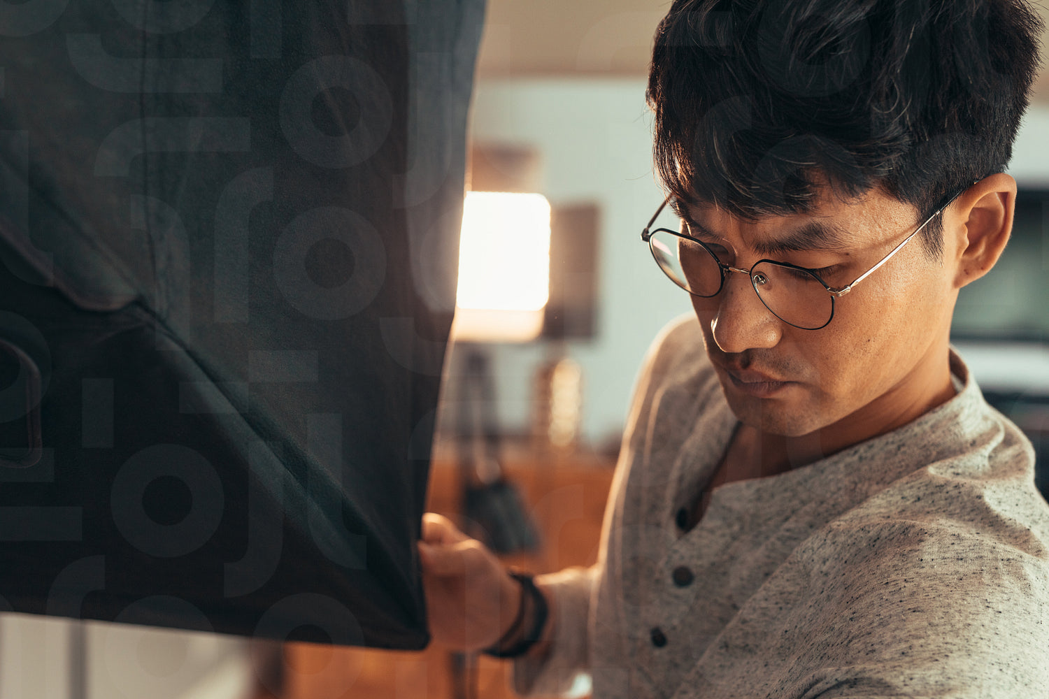 Photographer setting light equipment in photo studio before photo session. Professional photographer is adjusting softbox for photographing.