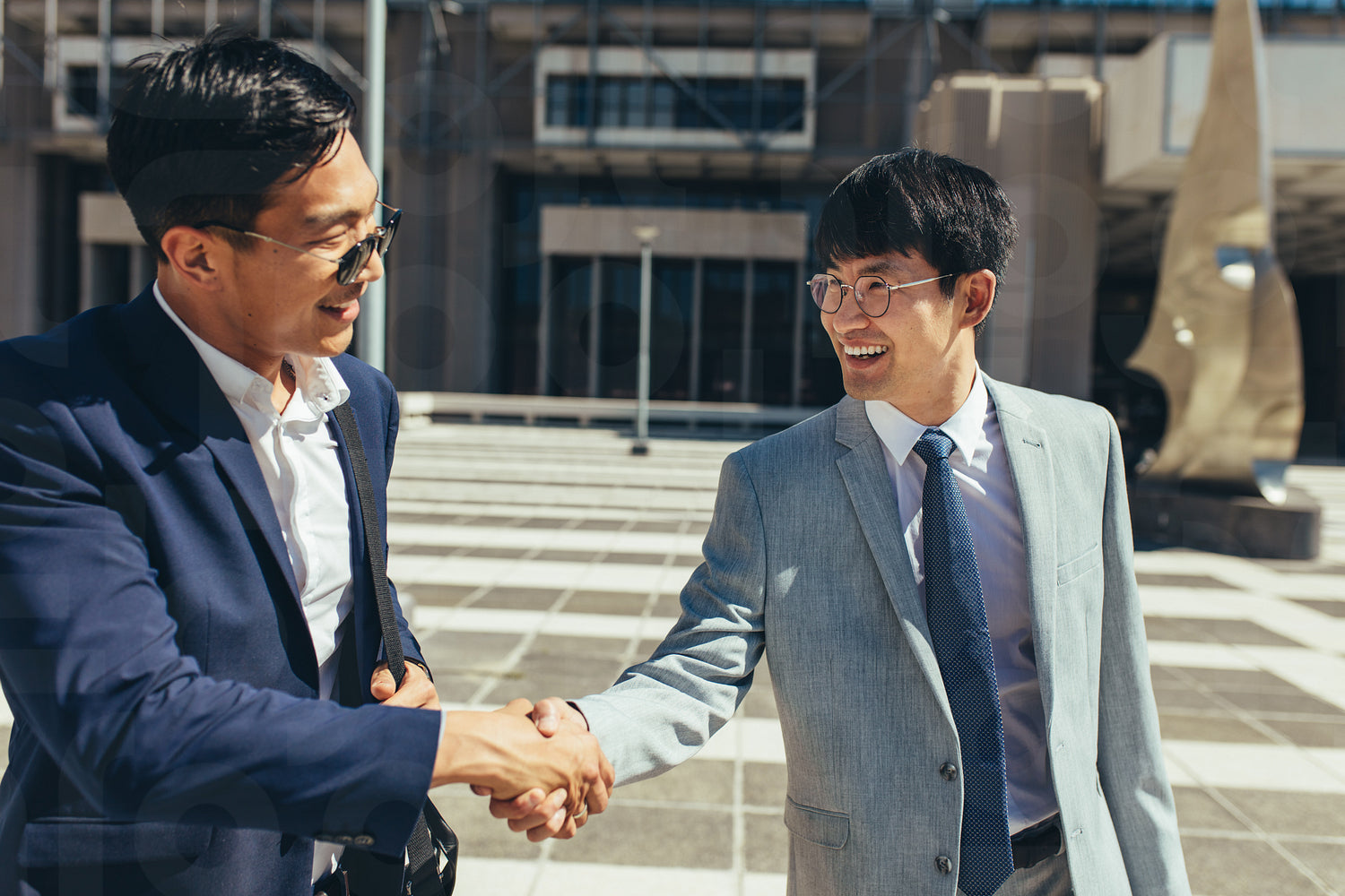 Two successful business men shaking hands outdoors. Asian businesspeople hand shake outdoors.