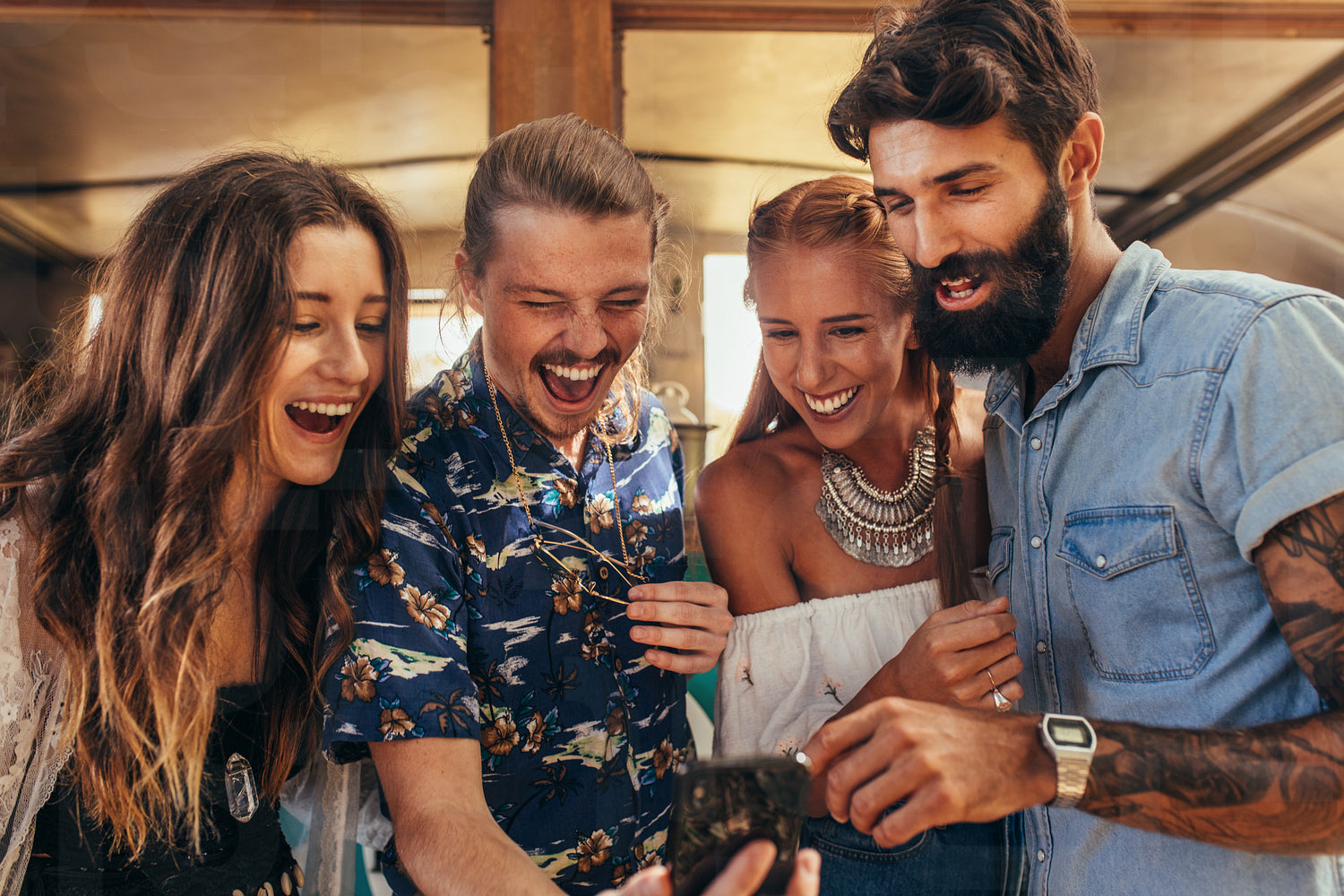 Cheerful young friends looking at mobile phone for a selfie. Group of men and women taking selfie outdoors.