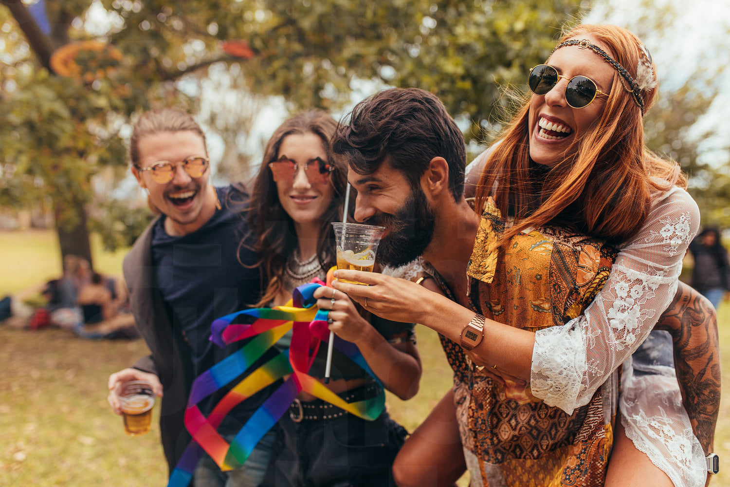 Young people at summer music festival. Man drinking beer from girlfriend's glass while piggybacking her at park.